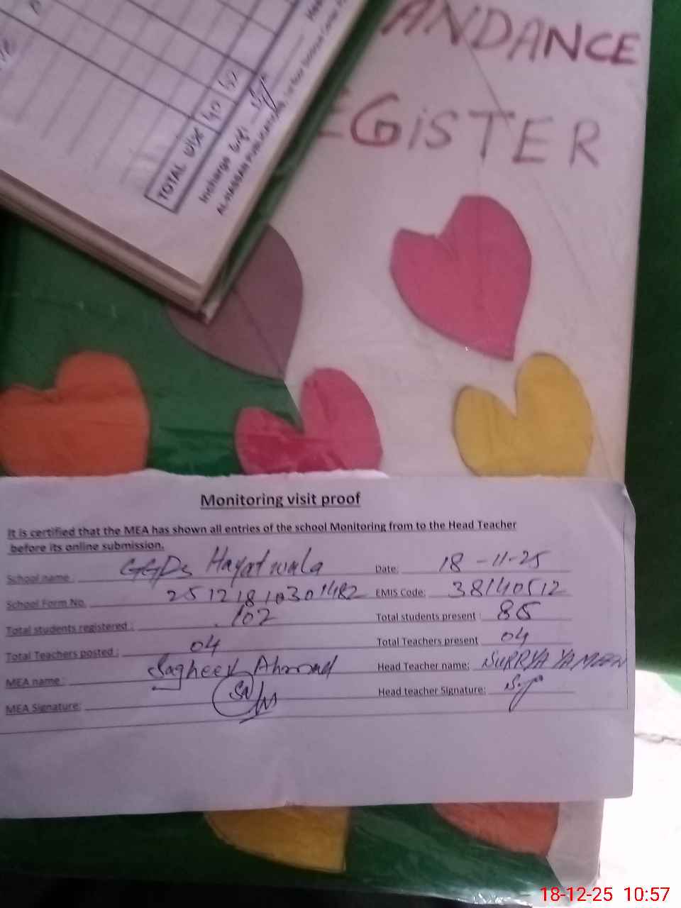 | EMIS Code: 38140512 | Name of School: GGPS HAYAT WALA | |||