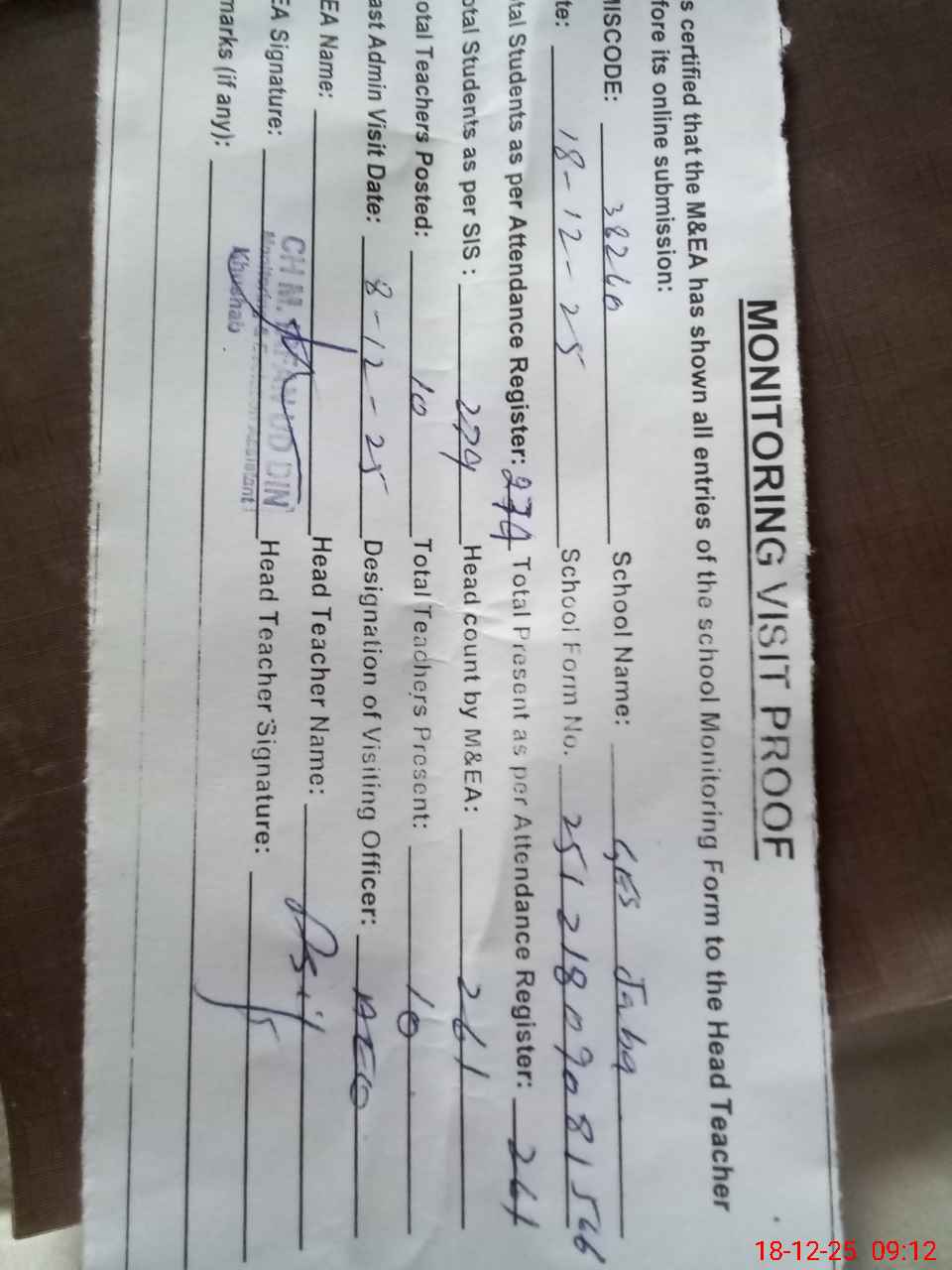 | Remarks (Use Separate Page if Required): student on sis 279 student on register 279 head count 261 no teacher absent last visit 8/12/25 aeo boundary wall damaged | |||||