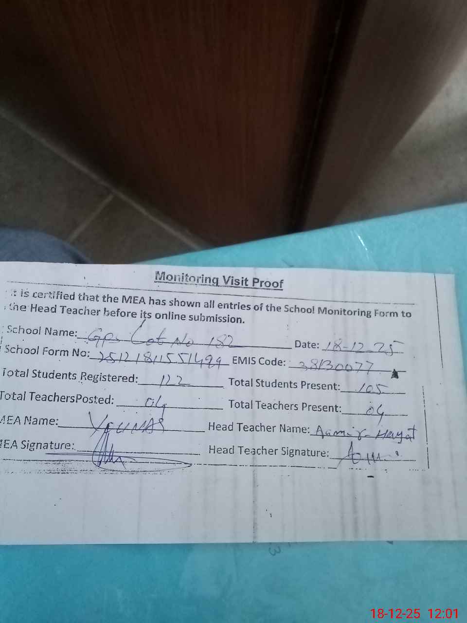 | Attendance Register | Head Teacher | MEA with School | Visit Proof |