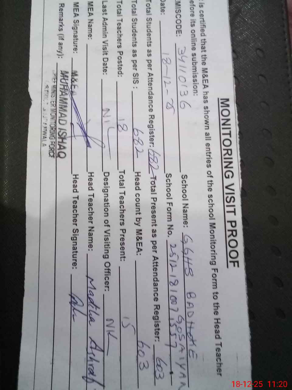 | Attendance Register | Head Teacher | MEA with School | Visit Proof |