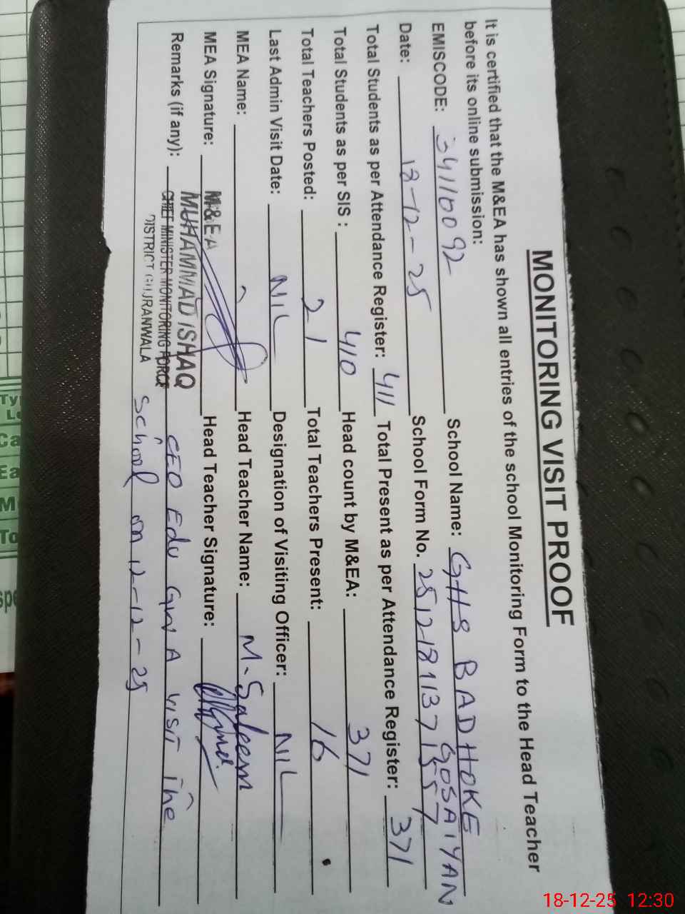 | EMIS Code: 34110092 | Name of School: GHS BADHOKE GOSAIYAN | |||