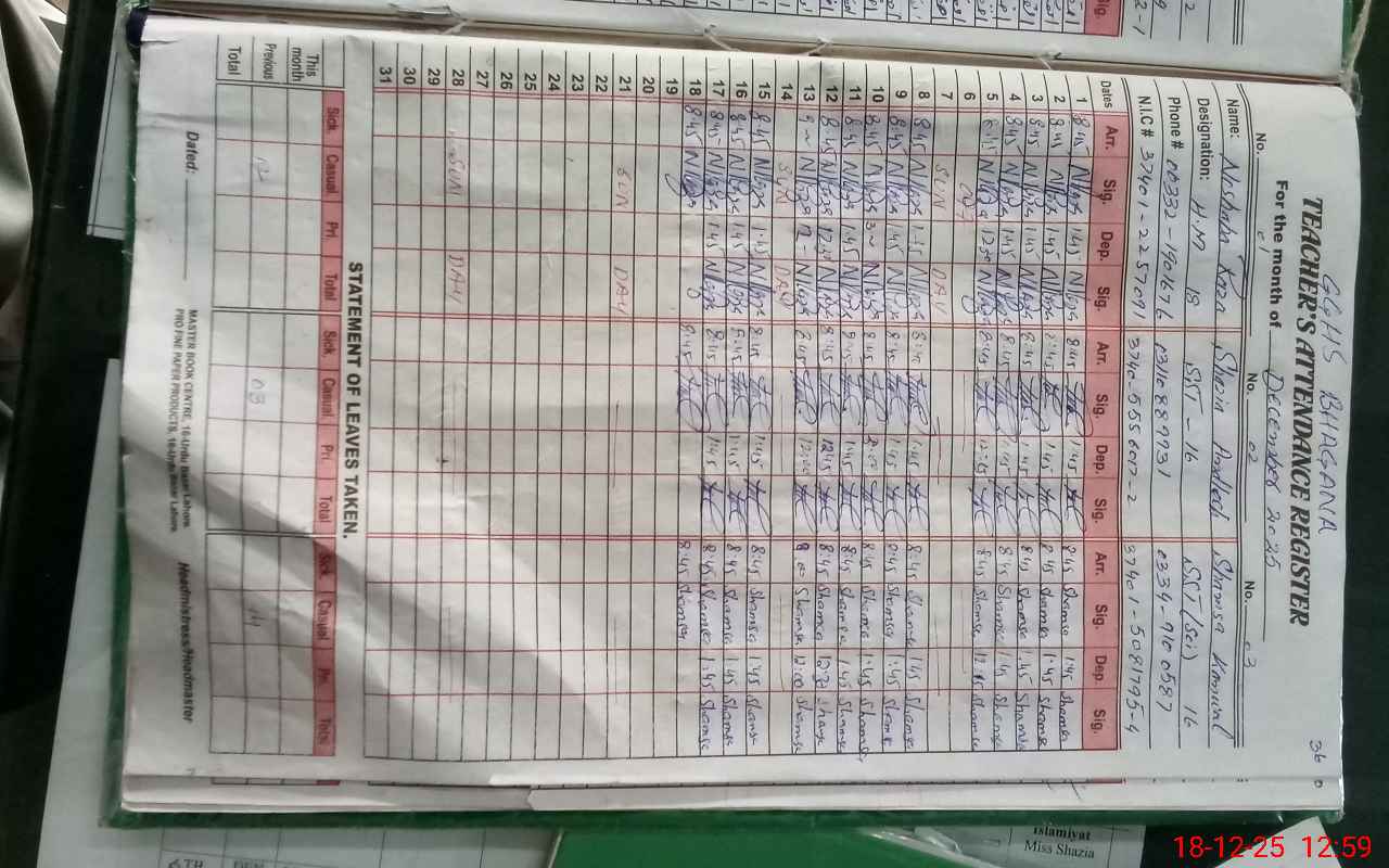 | CNIC | Full Name | Designation | R/C | Absence During Last Calender Month |