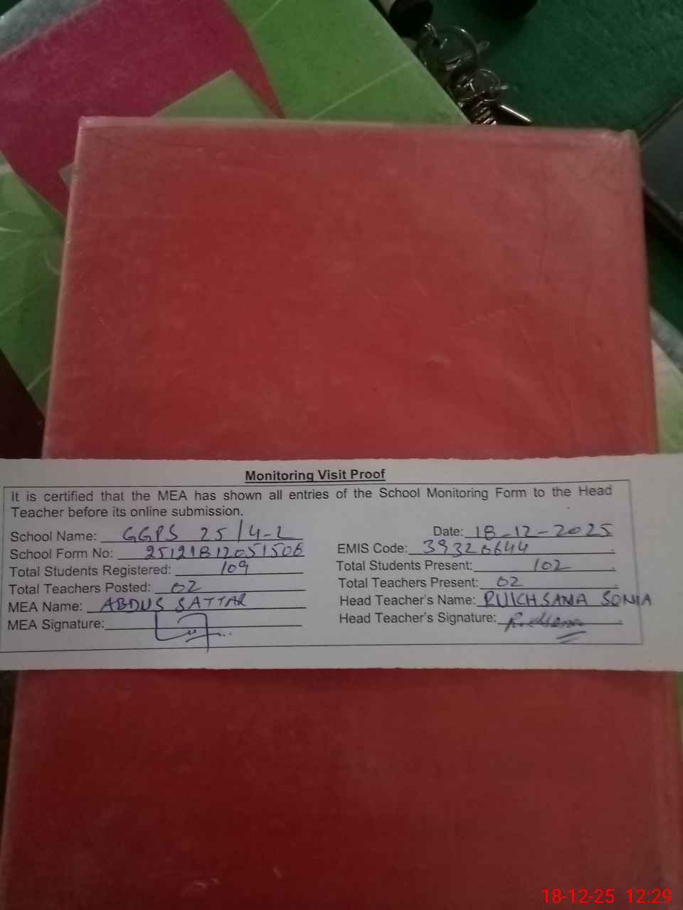 | Attendance Register | Head Teacher | MEA with School | Visit Proof |