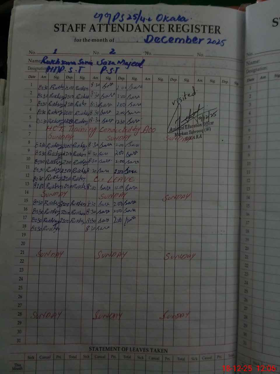 | District: OKARA | Tehsil: OKARA | Markaz: TABROOQ - FEMALE | Level: Primary | |