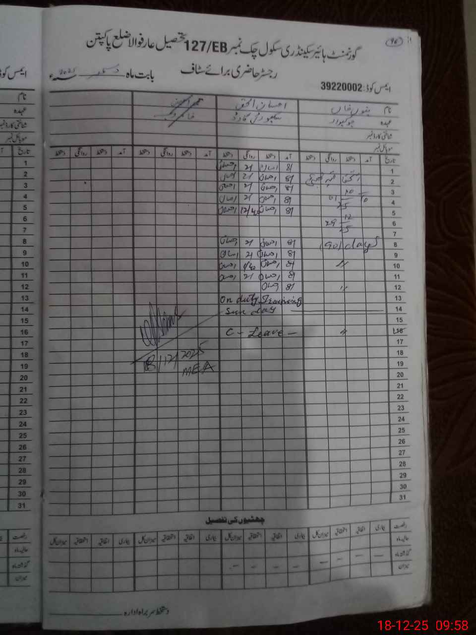 | CNIC | Full Name | Designation | R/C | Absence During Last Calender Month |