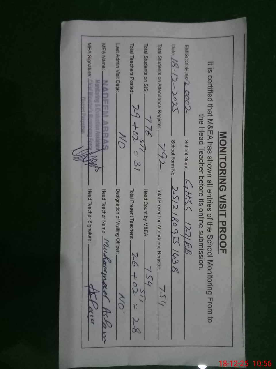 | Attendance Register | Head Teacher | MEA with School | Visit Proof |