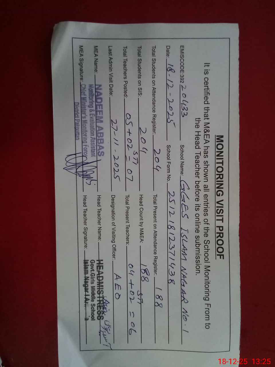 | Attendance Register | Head Teacher | MEA with School | Visit Proof |