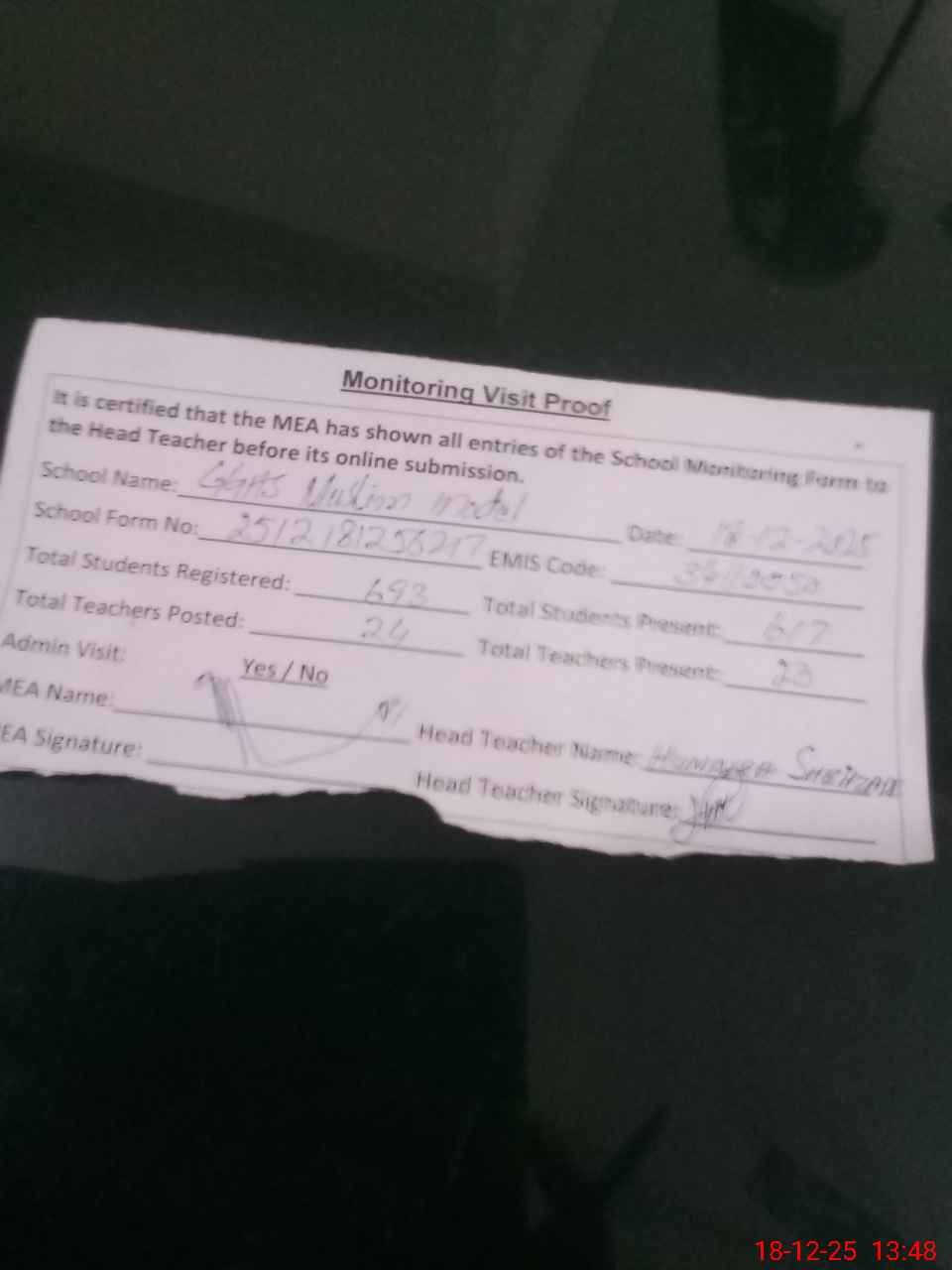 | Attendance Register | Head Teacher | MEA with School | Visit Proof |