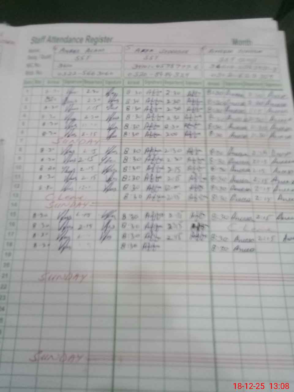 | CNIC | Full Name | Designation | R/C | Absence during last cal. month |