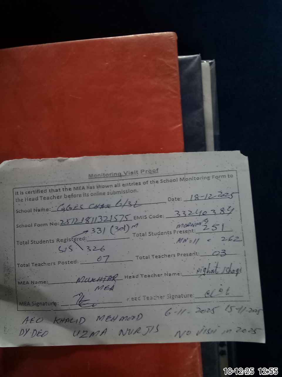 | Attendance Register | Head Teacher | MEA with School | Visit Proof |