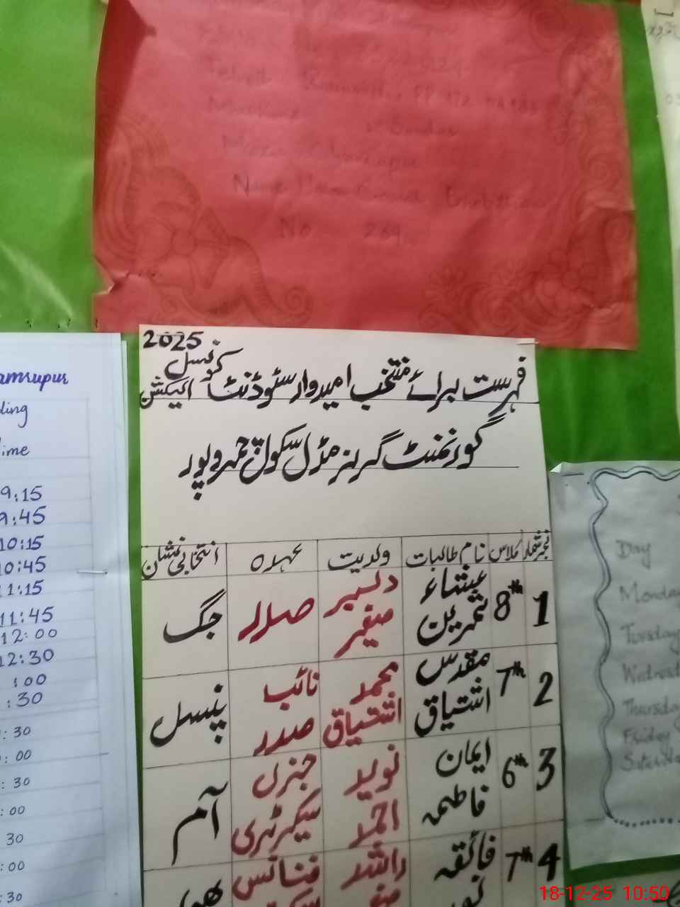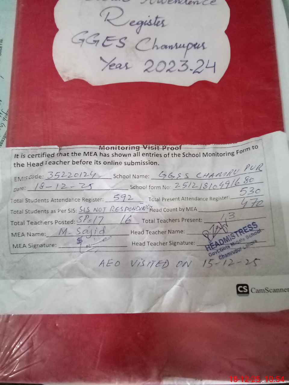 | Remarks (Use Separate Page if Required): PST Amna Raza is long absent since 20 June 2025 A difference of 60 students found in Roznamcha and head count Two classrooms construction has started two weeks back Less number of soap are found at hand wash points 35220124 | |||||