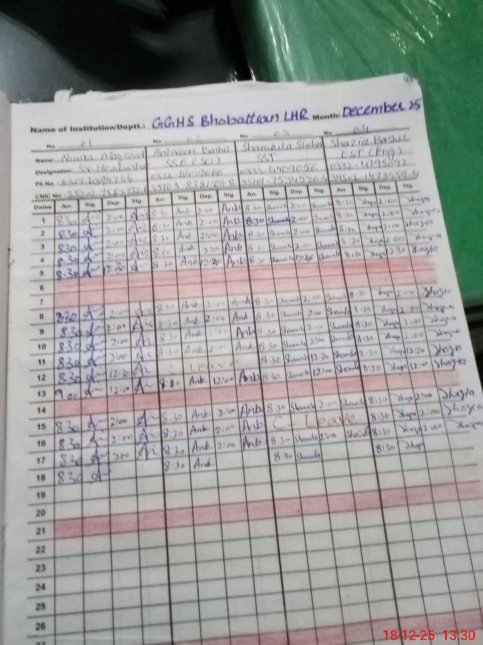 | CNIC | Full Name | Designation | R/C | Absence during last cal. month |