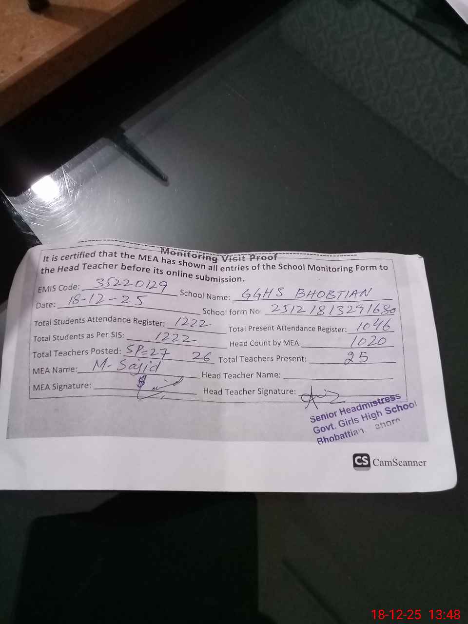 | Attendance Register | Head Teacher | MEA with School | Visit Proof |