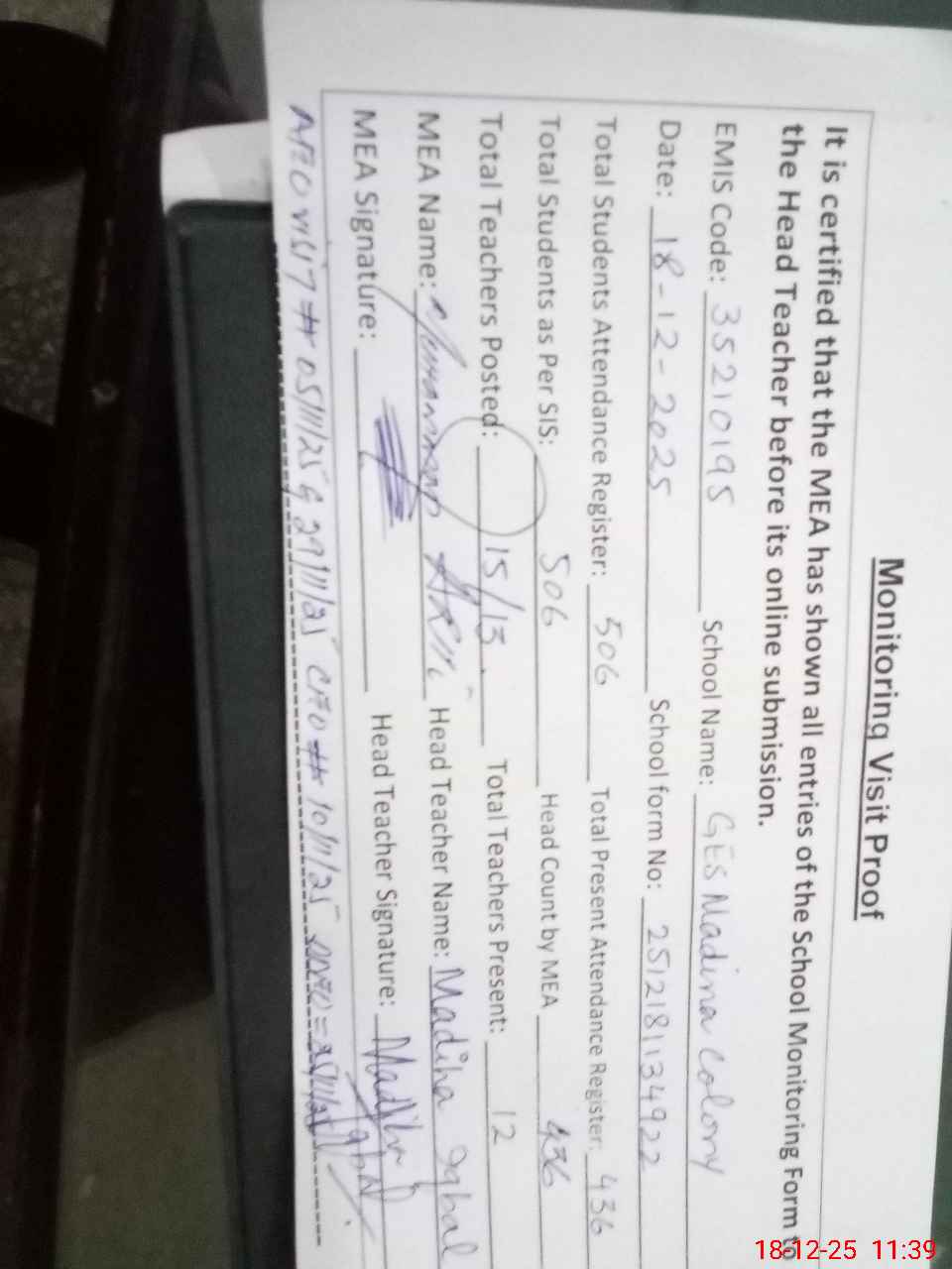 | Attendance Register | Head Teacher | MEA with School | Visit Proof |