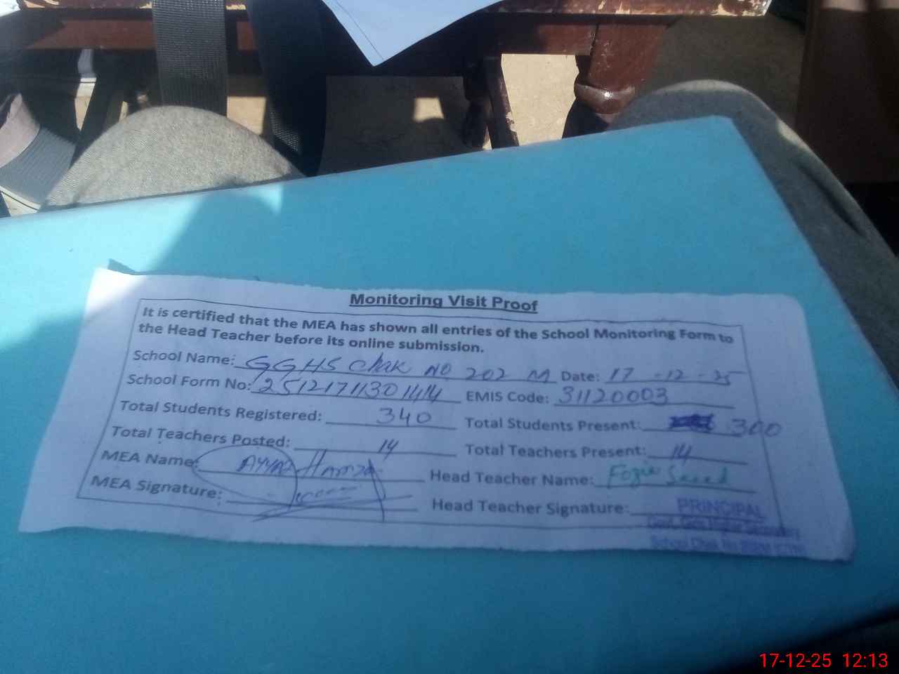 | EMIS Code: 31120003 | Name of School: GGHSS CHAK NO. 202 M (WEST | |||