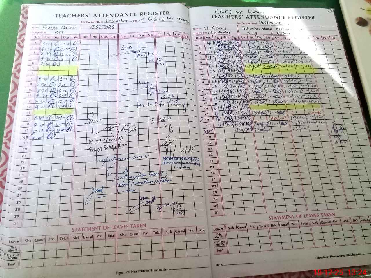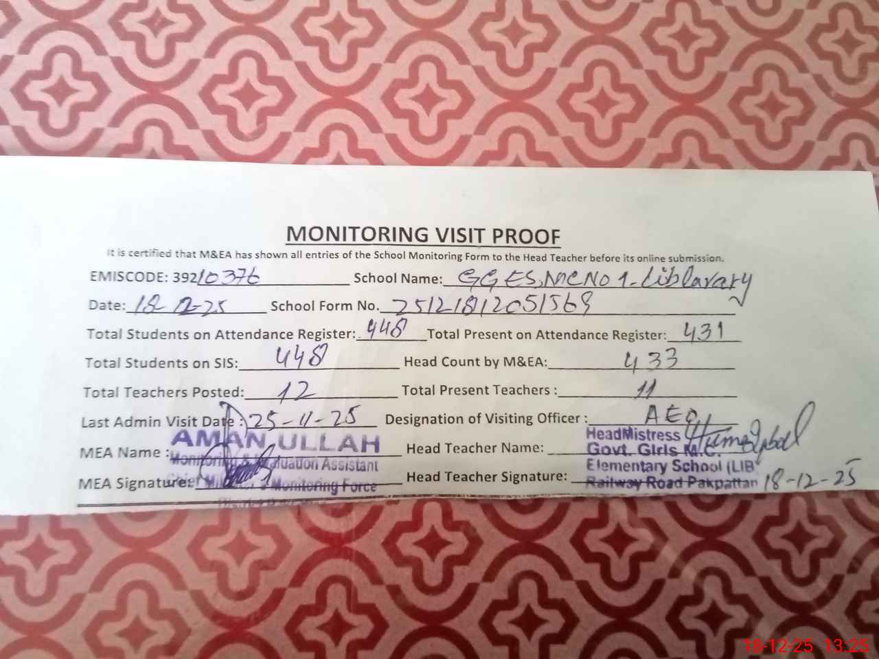 | Attendance Register | Head Teacher | MEA with School | Visit Proof |
