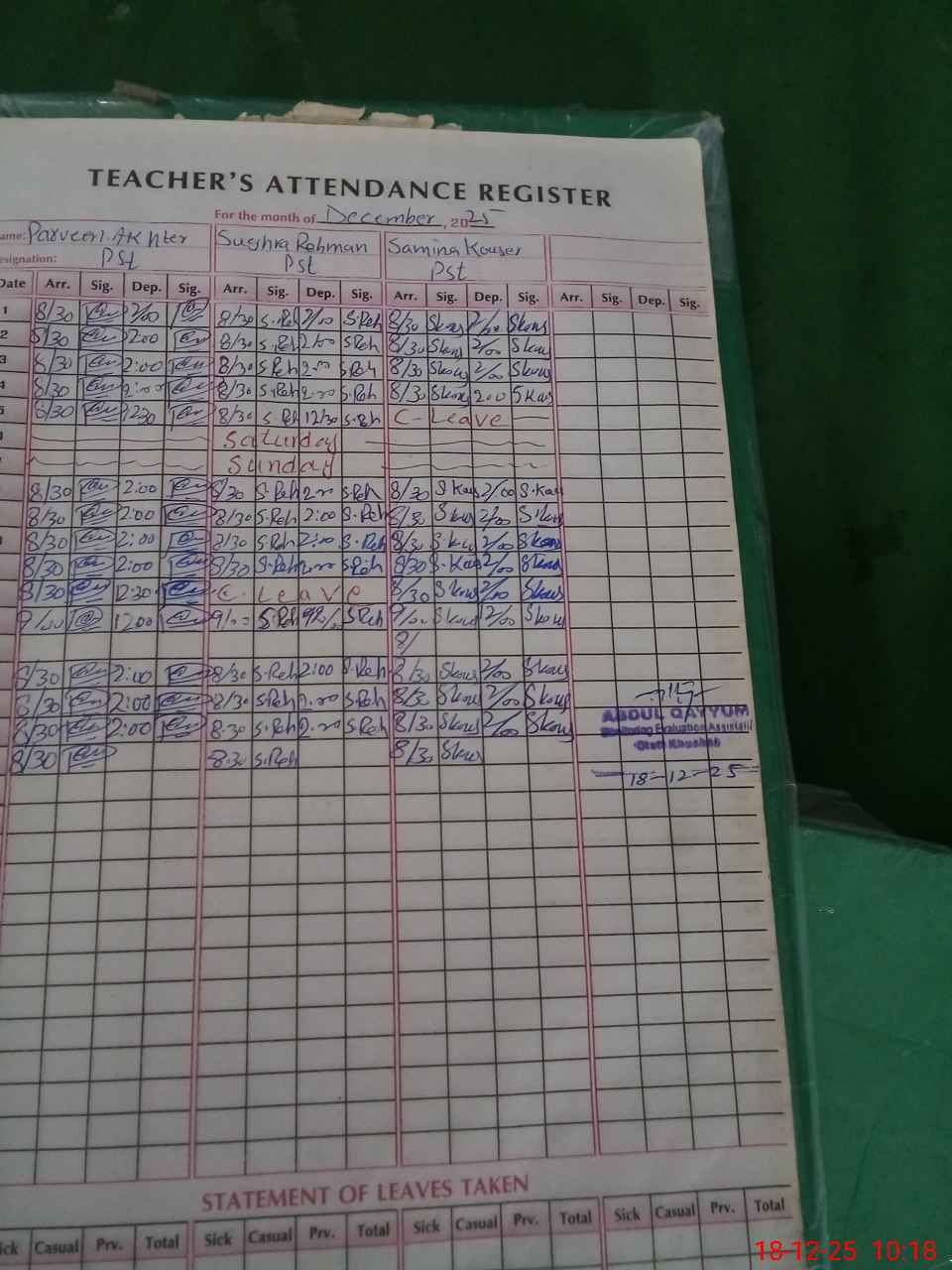 | Leave | Duty | Absent | Maternity | Medical | Ex- Pak |