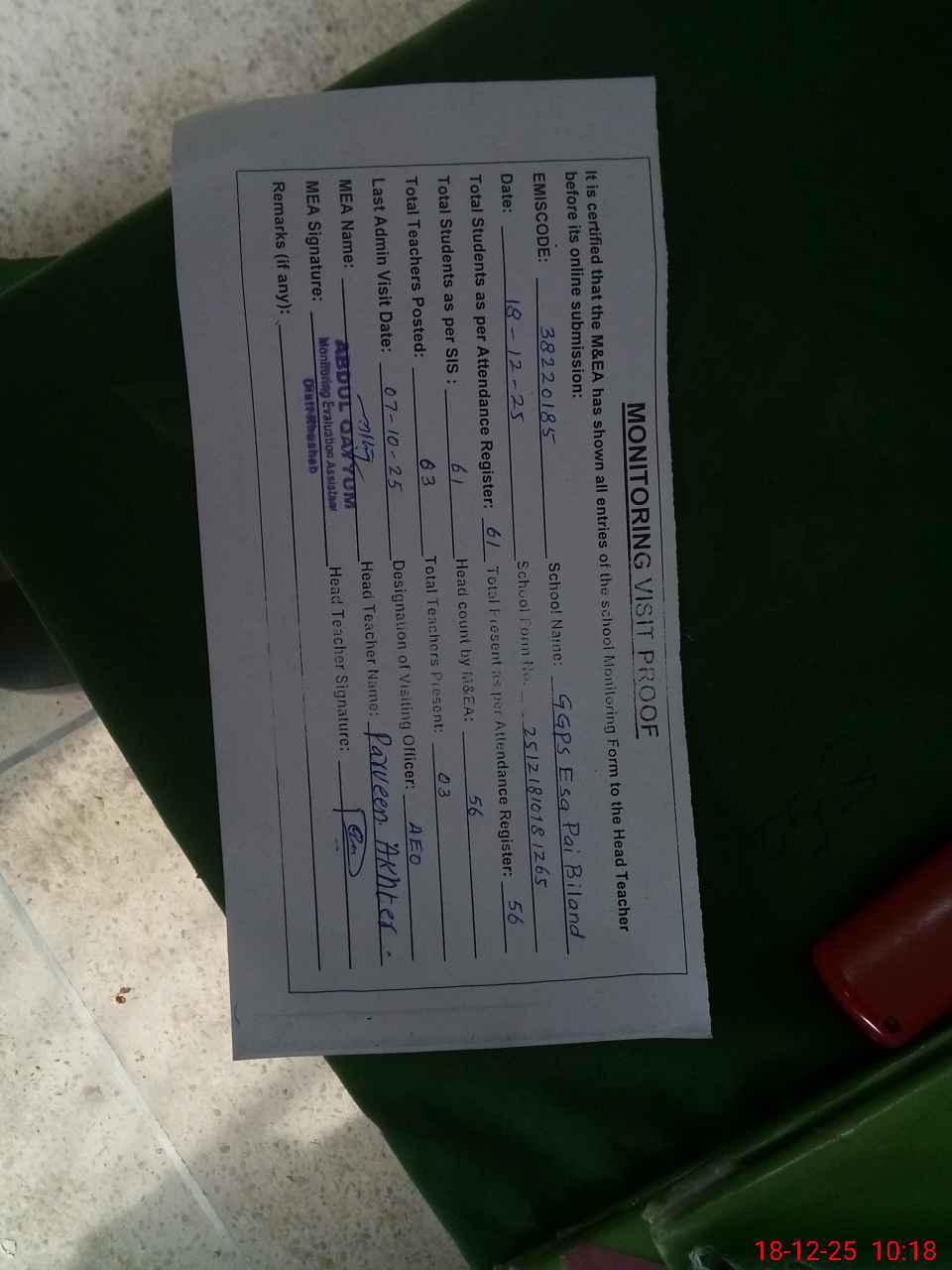 | Attendance Register | Head Teacher | MEA with School | Visit Proof |