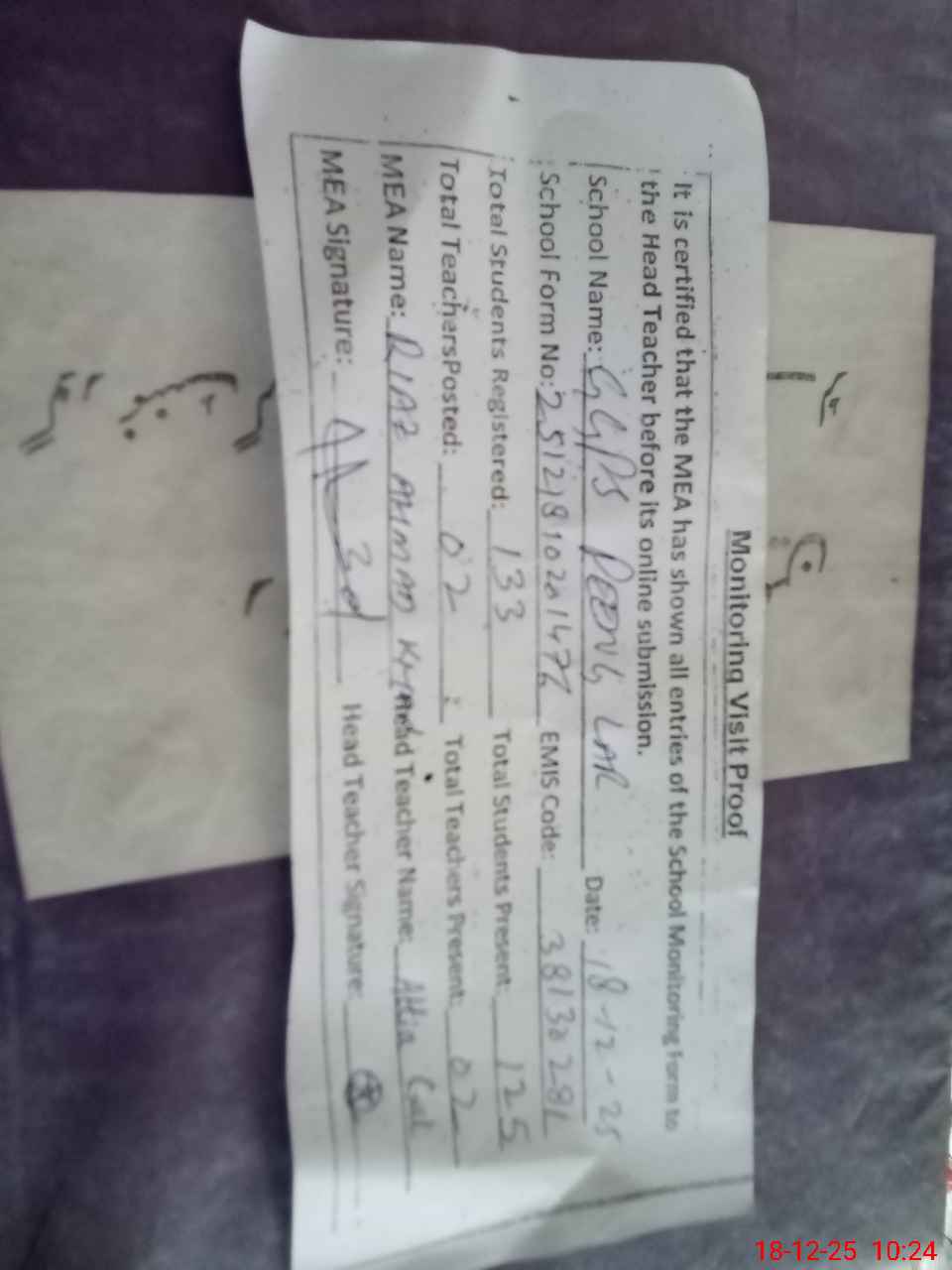 | Attendance Register | Head Teacher | MEA with School | Visit Proof |