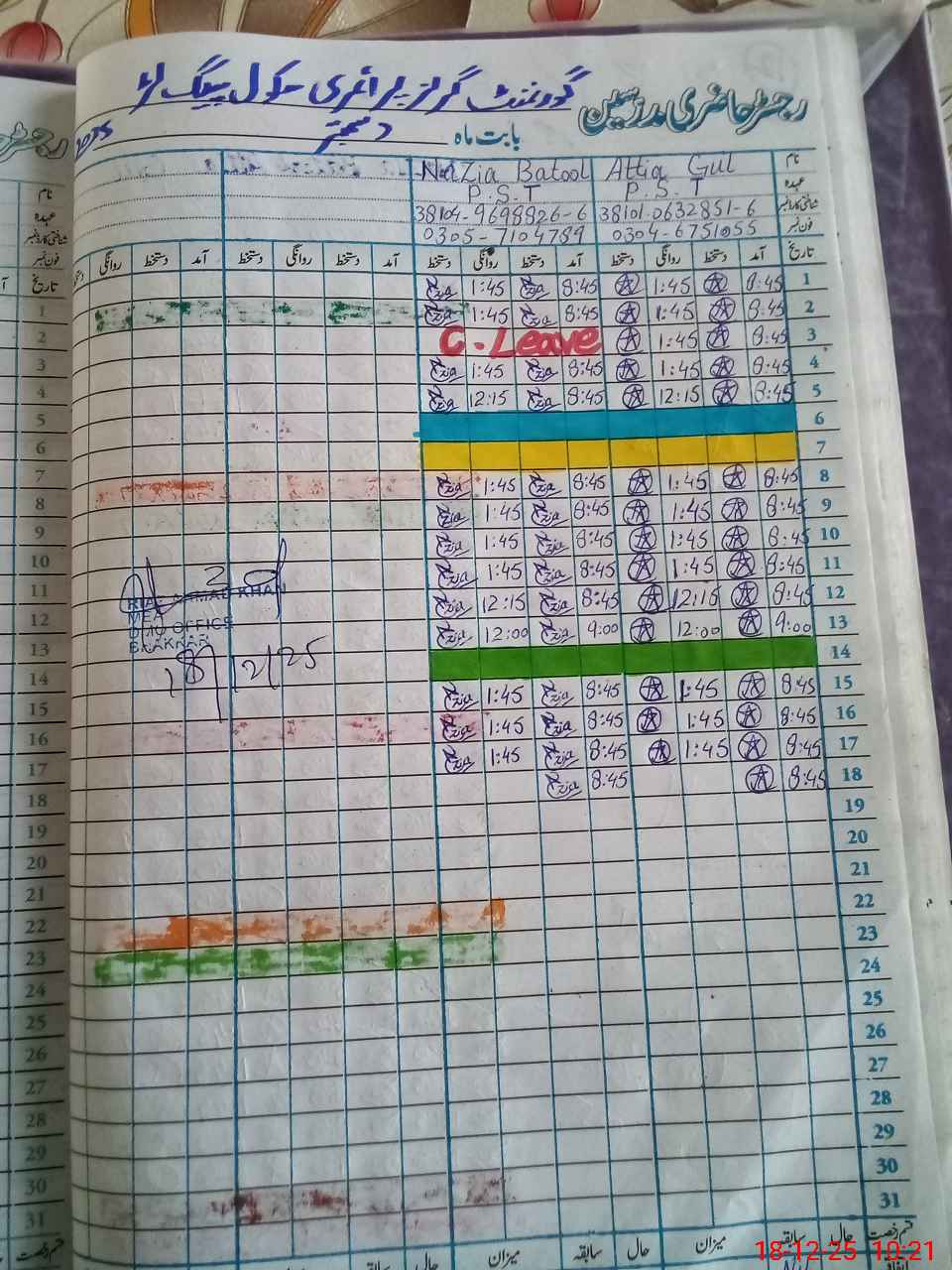 | CNIC | Full Name | Designation | R/C | Absence During Last Calender Month |