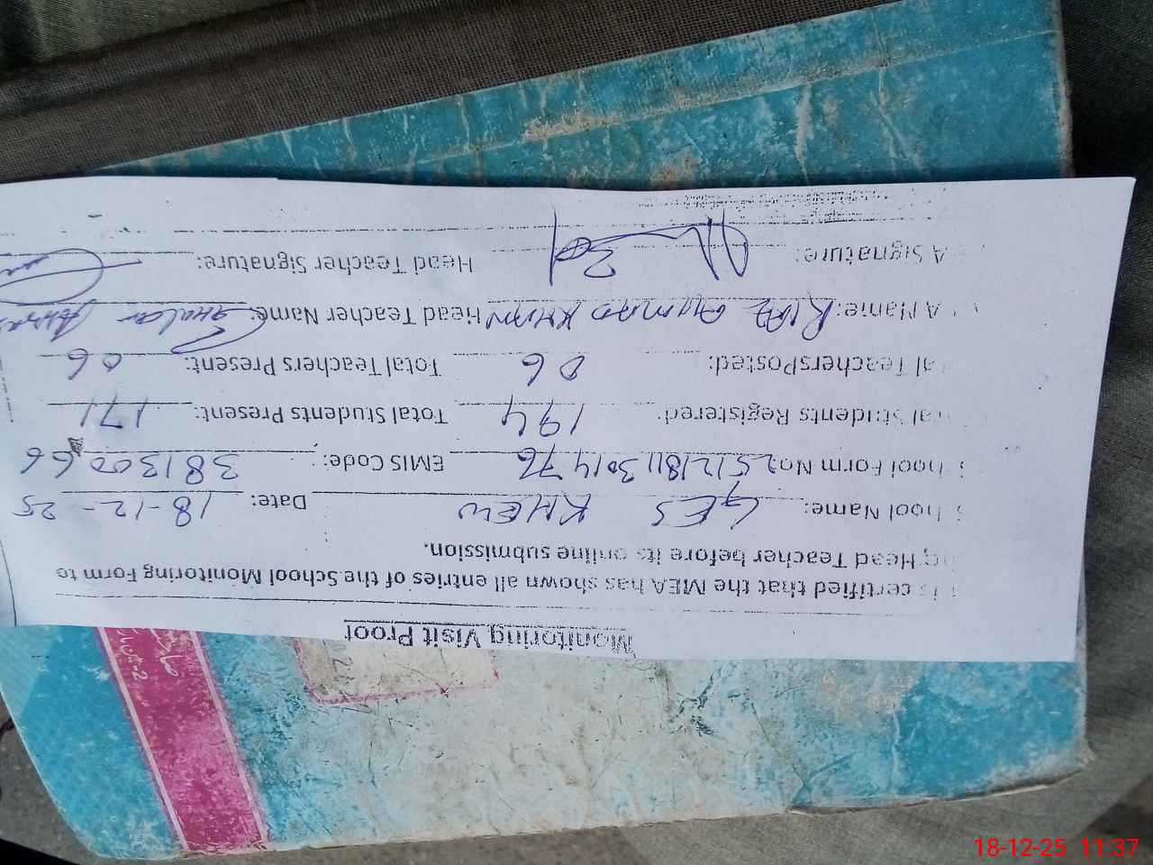 | Attendance Register | Head Teacher | MEA with School | Visit Proof |