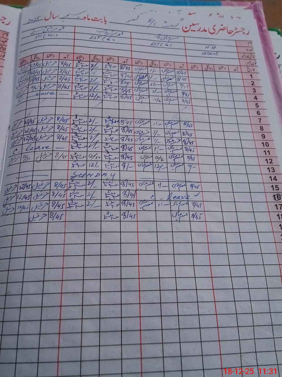 | CNIC | Full Name | Designation | R/C | Absence During Last Calender Month |