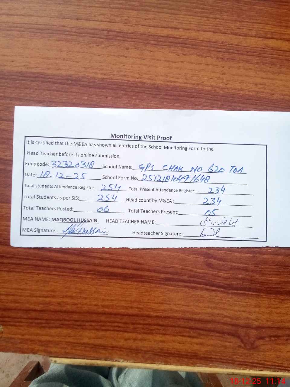 | Attendance Register | Head Teacher | MEA with School | Visit Proof |