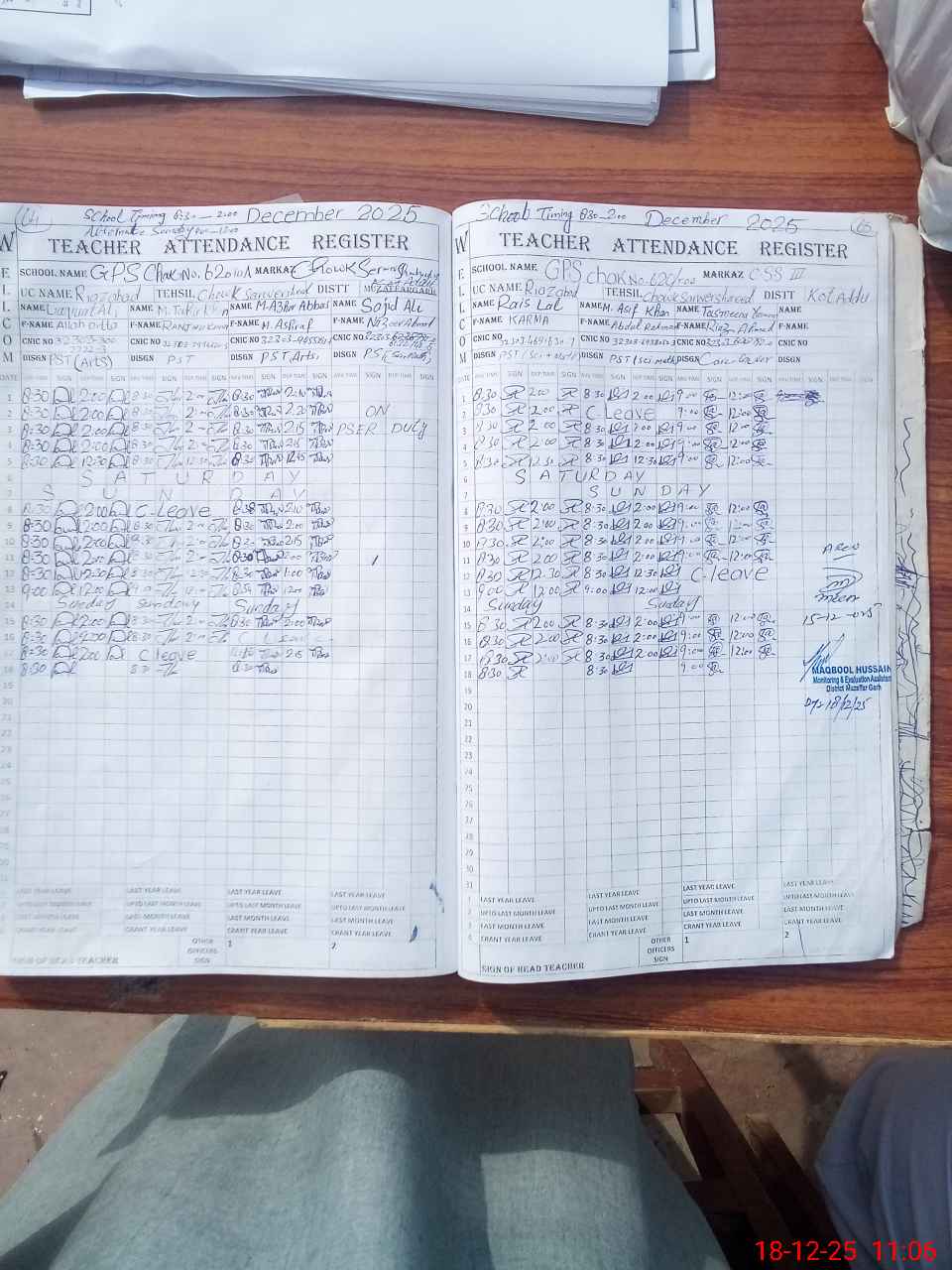 | CNIC | Full Name | Designation | R/C | Absence during last cal. month |