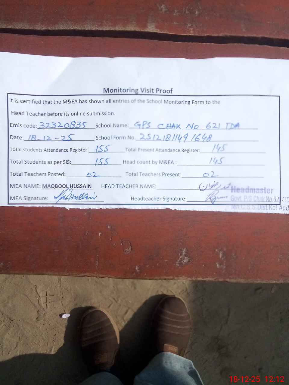 | Attendance Register | Head Teacher | MEA with School | Visit Proof |