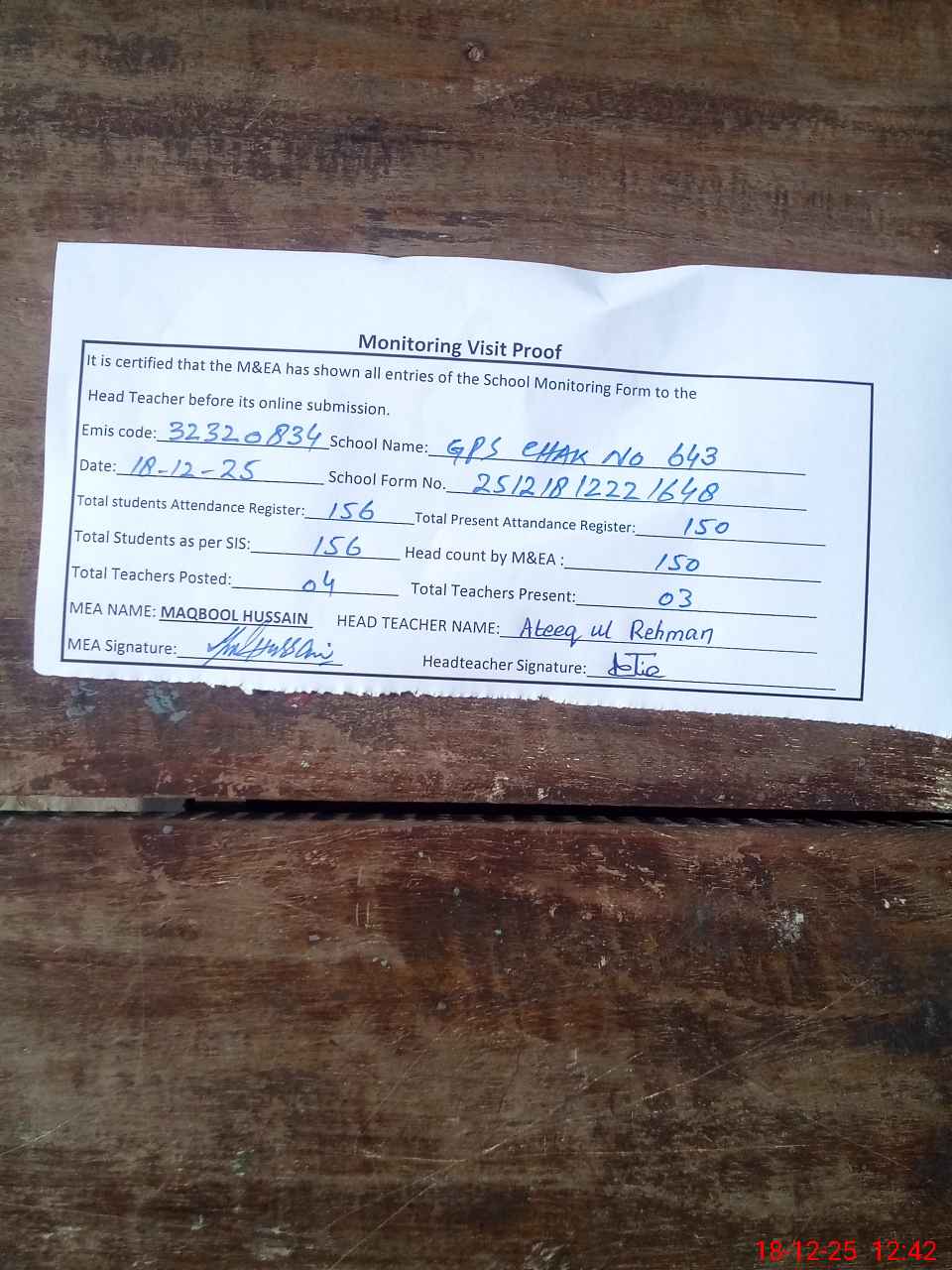 | EMIS Code: 32320834 | Name of School: GPS CHAK NO.643/TDA | |||