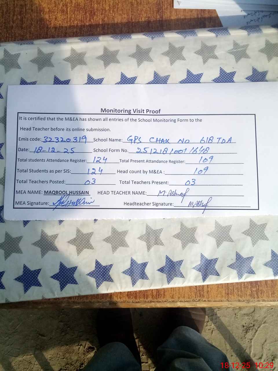 | EMIS Code: 32320319 | Name of School: GPS CHAK NO. 618 TDA | |||