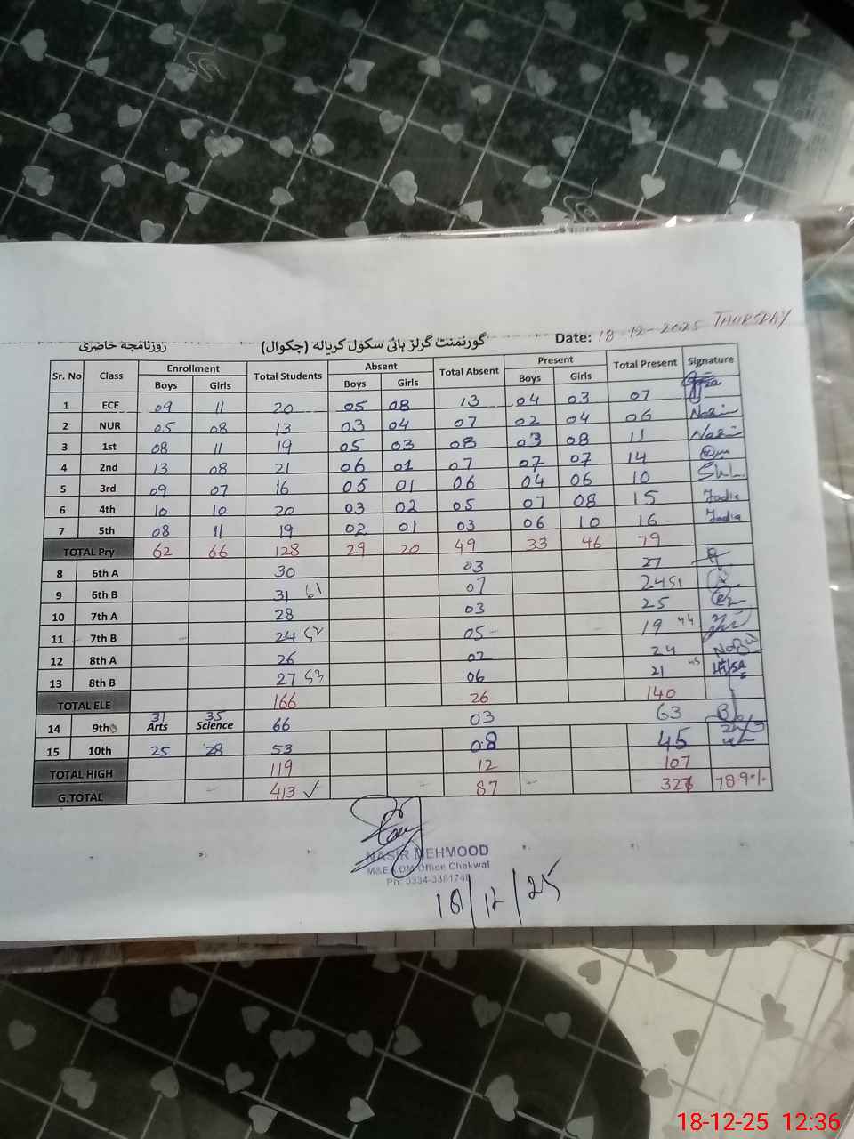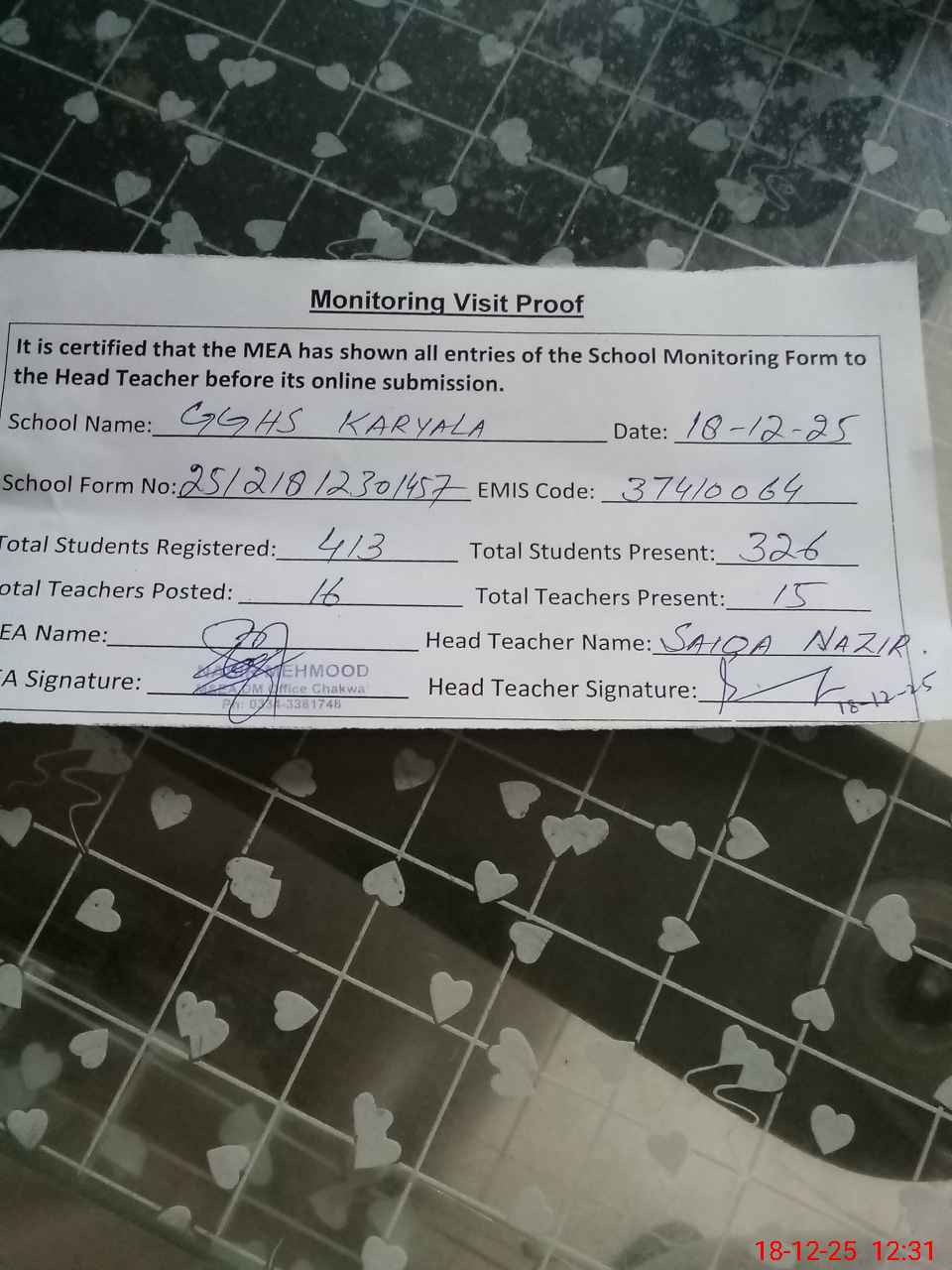 | Attendance Register | Head Teacher | MEA with School | Visit Proof |