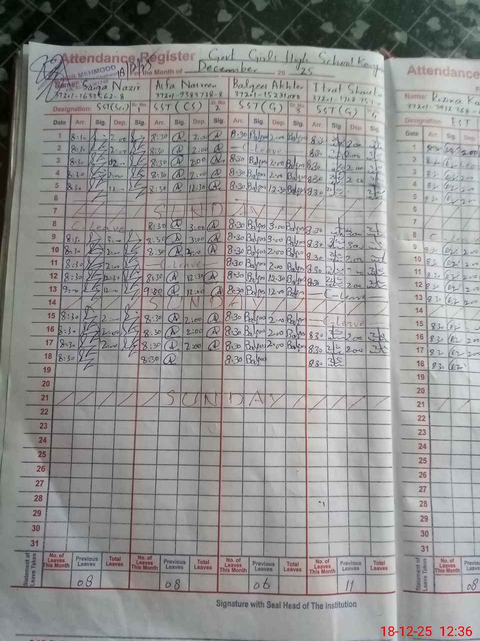 | CNIC | Full Name | Designation | R/C | Absence During Last Calender Month |