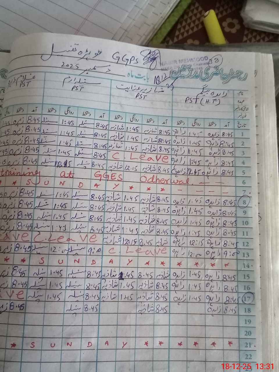 | CNIC | Full Name | Designation | R/C | Absence During Last Calender Month |
