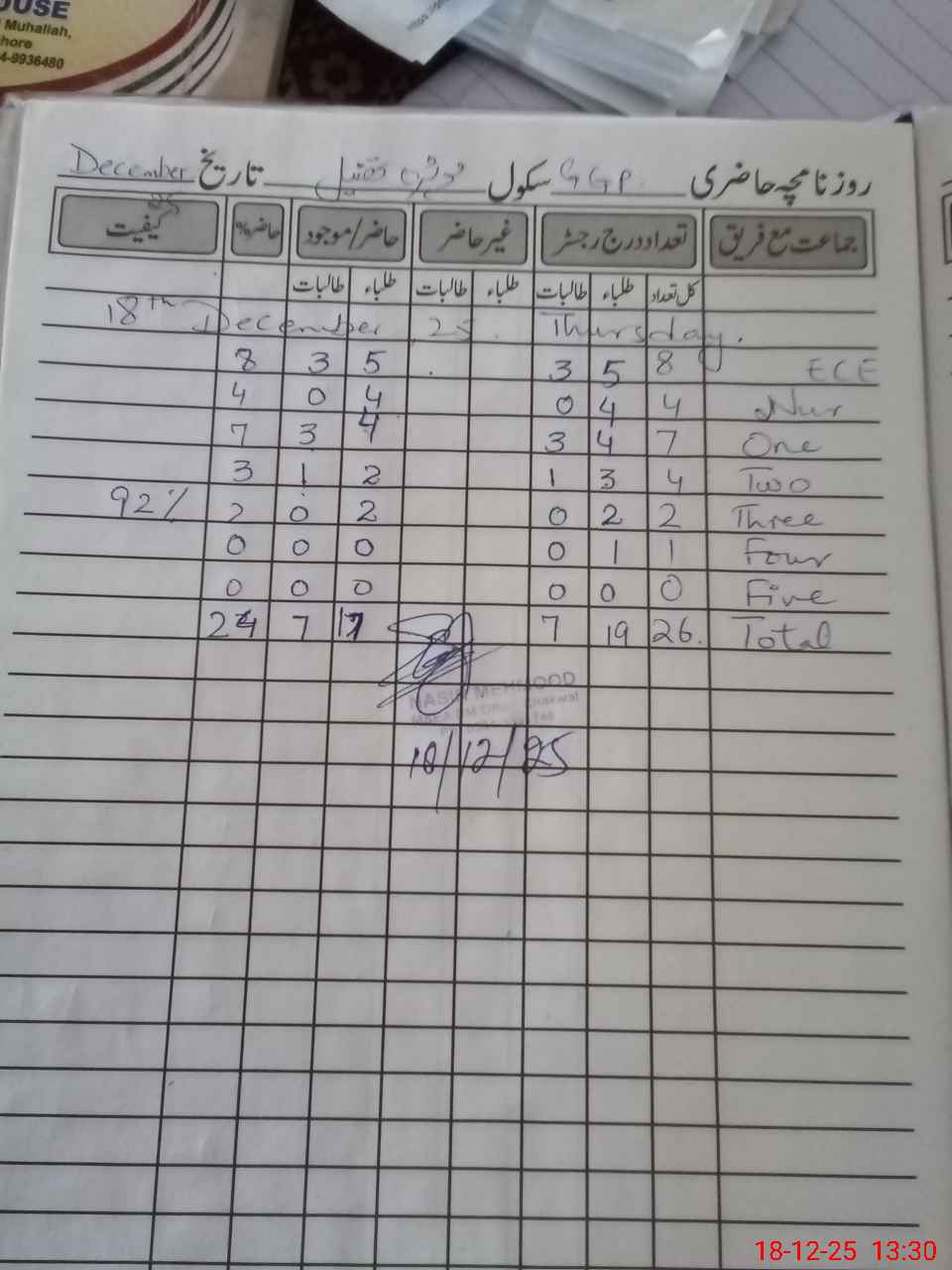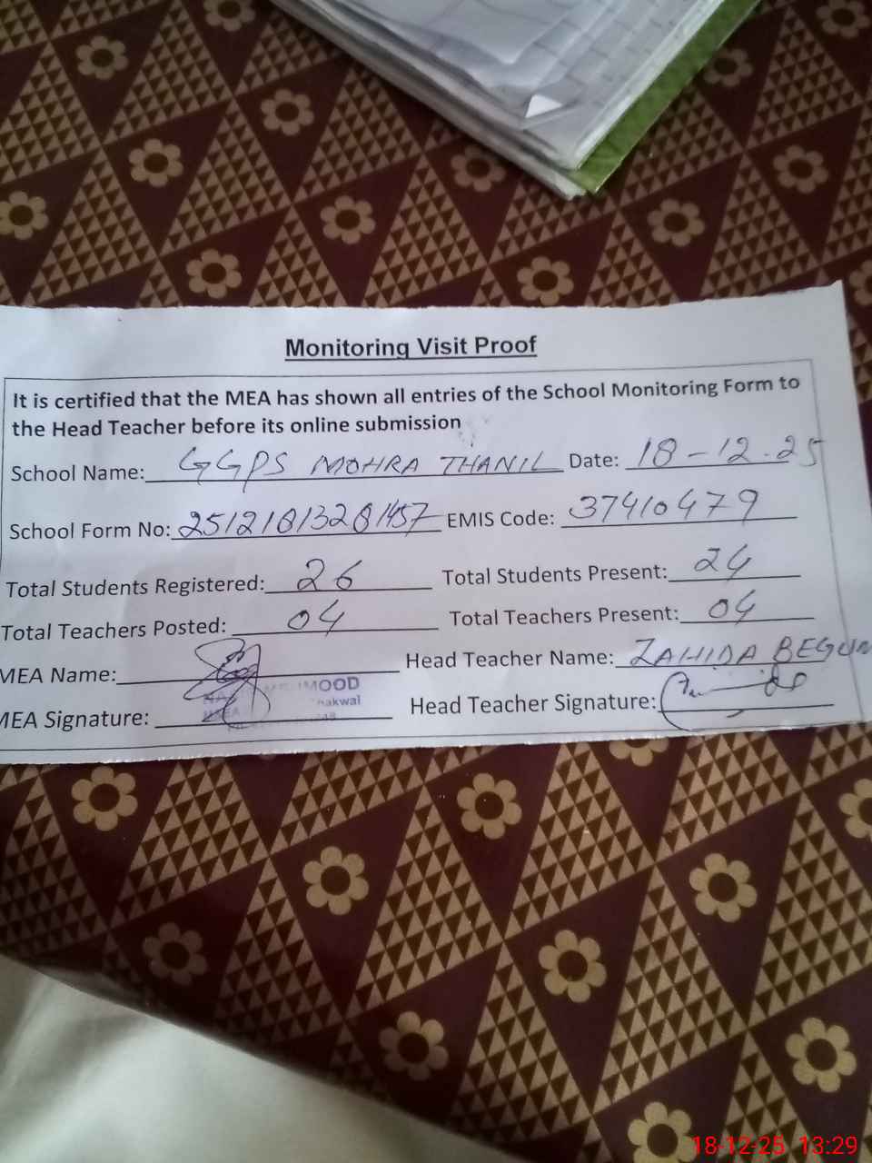 | Attendance Register | Head Teacher | MEA with School | Visit Proof |