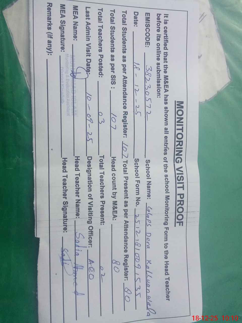 | Remarks (Use Separate Page if Required): AEO visited school on 10 October 2025 students strength on sis 107 | |||||