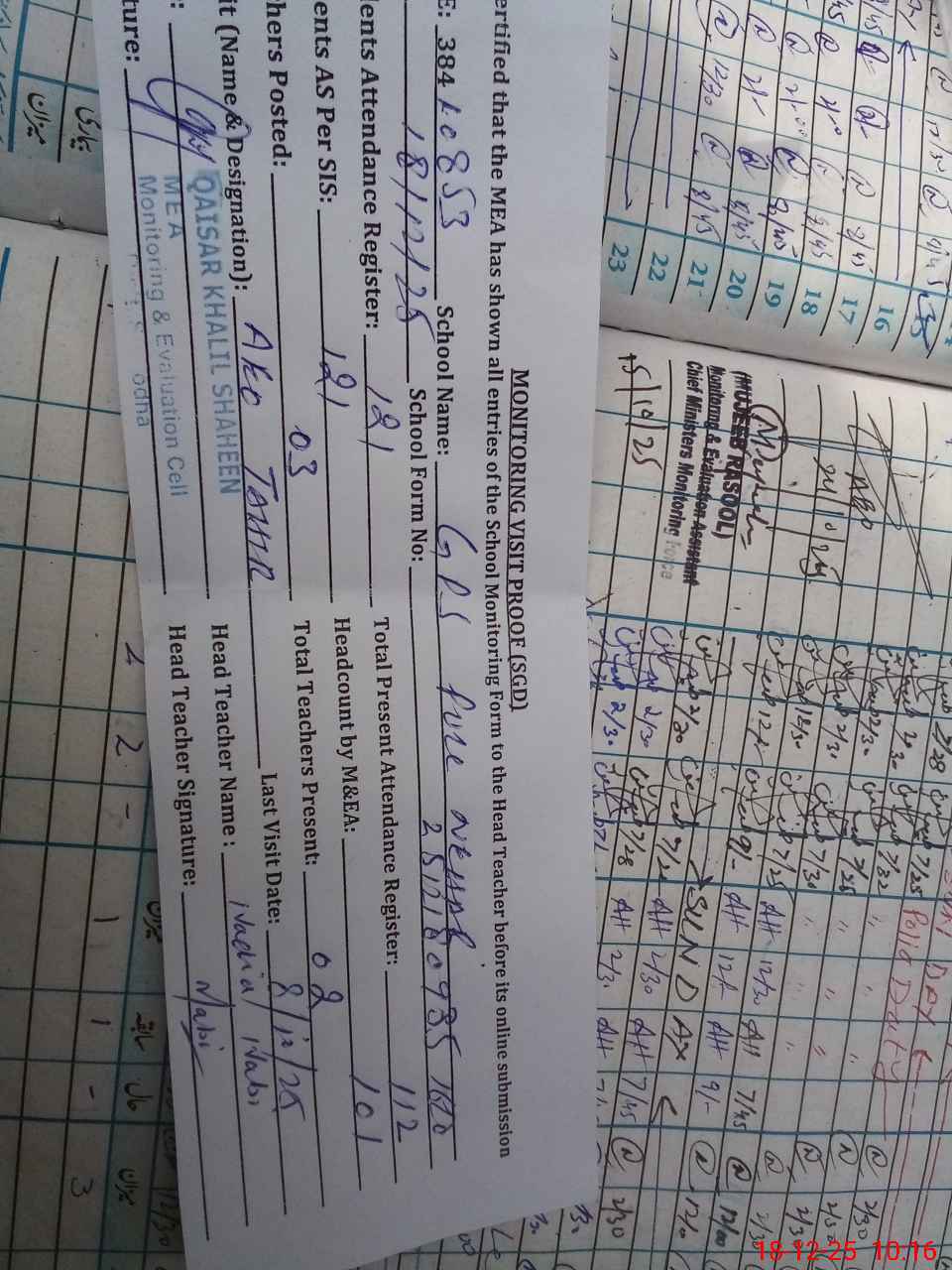 | Attendance Register | Head Teacher | MEA with School | Visit Proof |