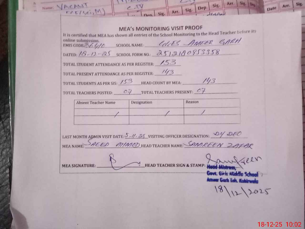 | Attendance Register | Head Teacher | MEA with School | Visit Proof |