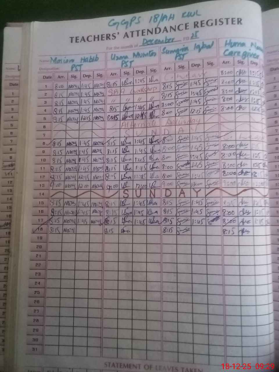 | CNIC | Full Name | Designation | R/C | Absence During Last Calender Month |