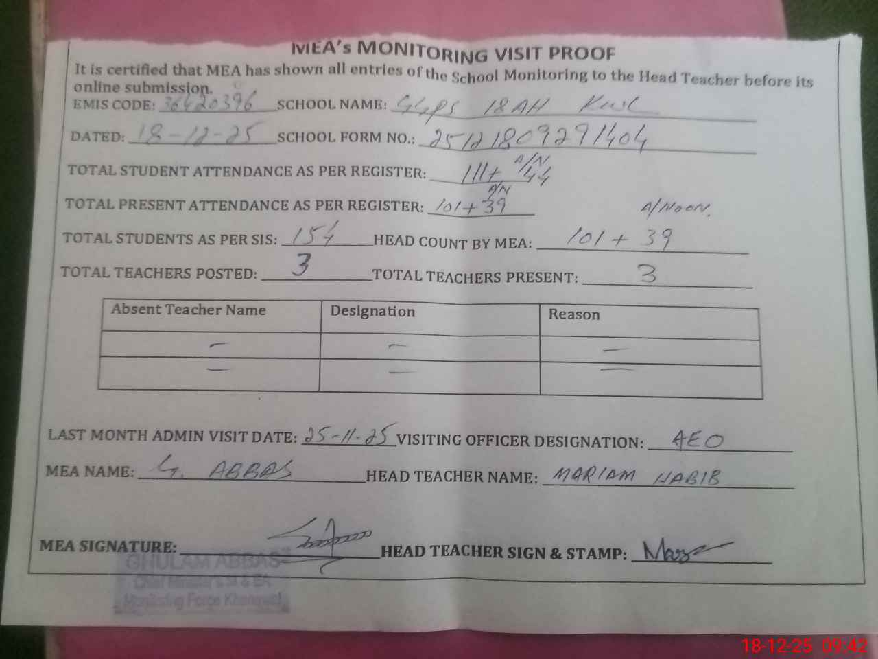 | Attendance Register | Head Teacher | MEA with School | Visit Proof |