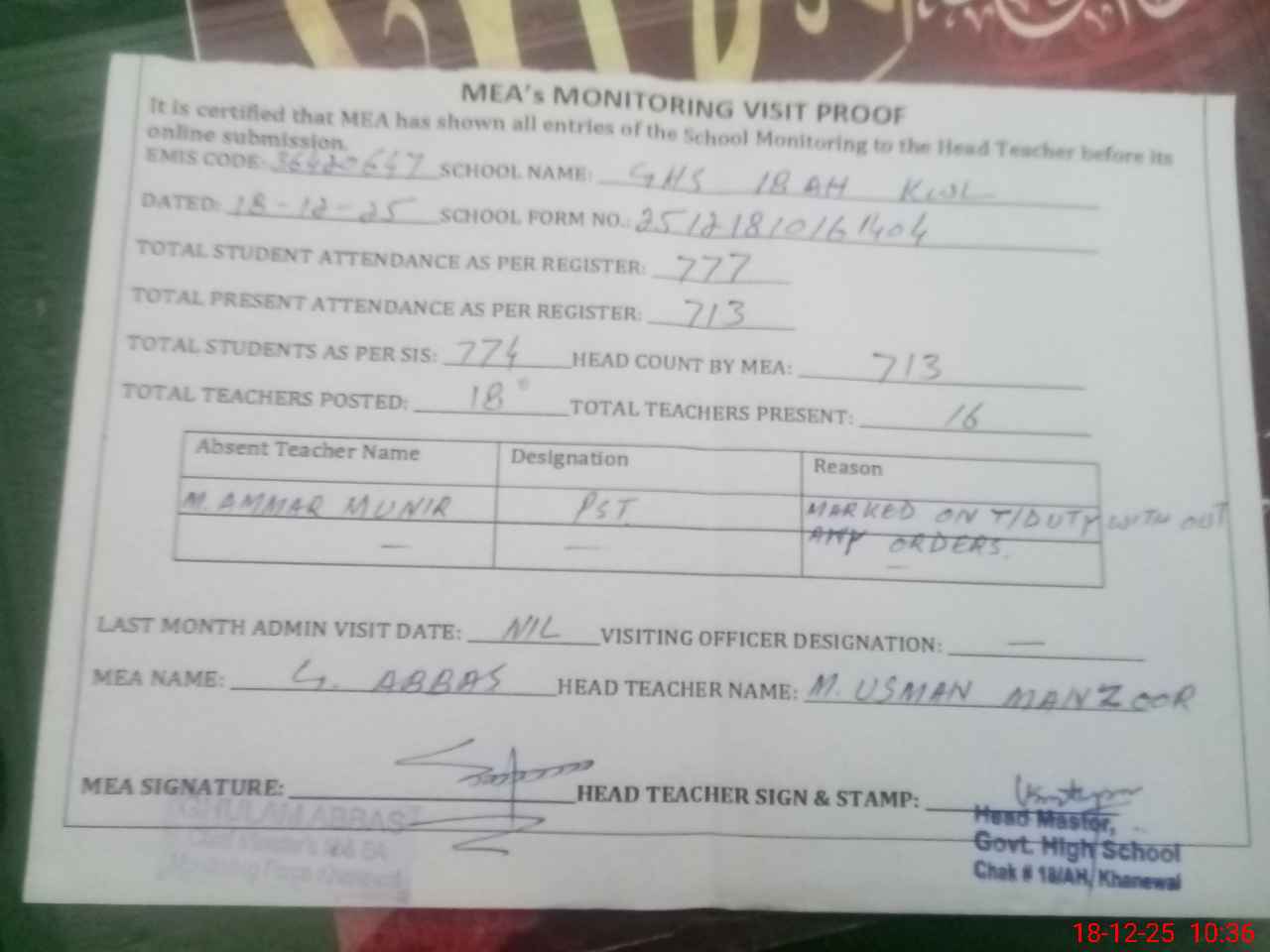 | Attendance Register | Head Teacher | MEA with School | Visit Proof |