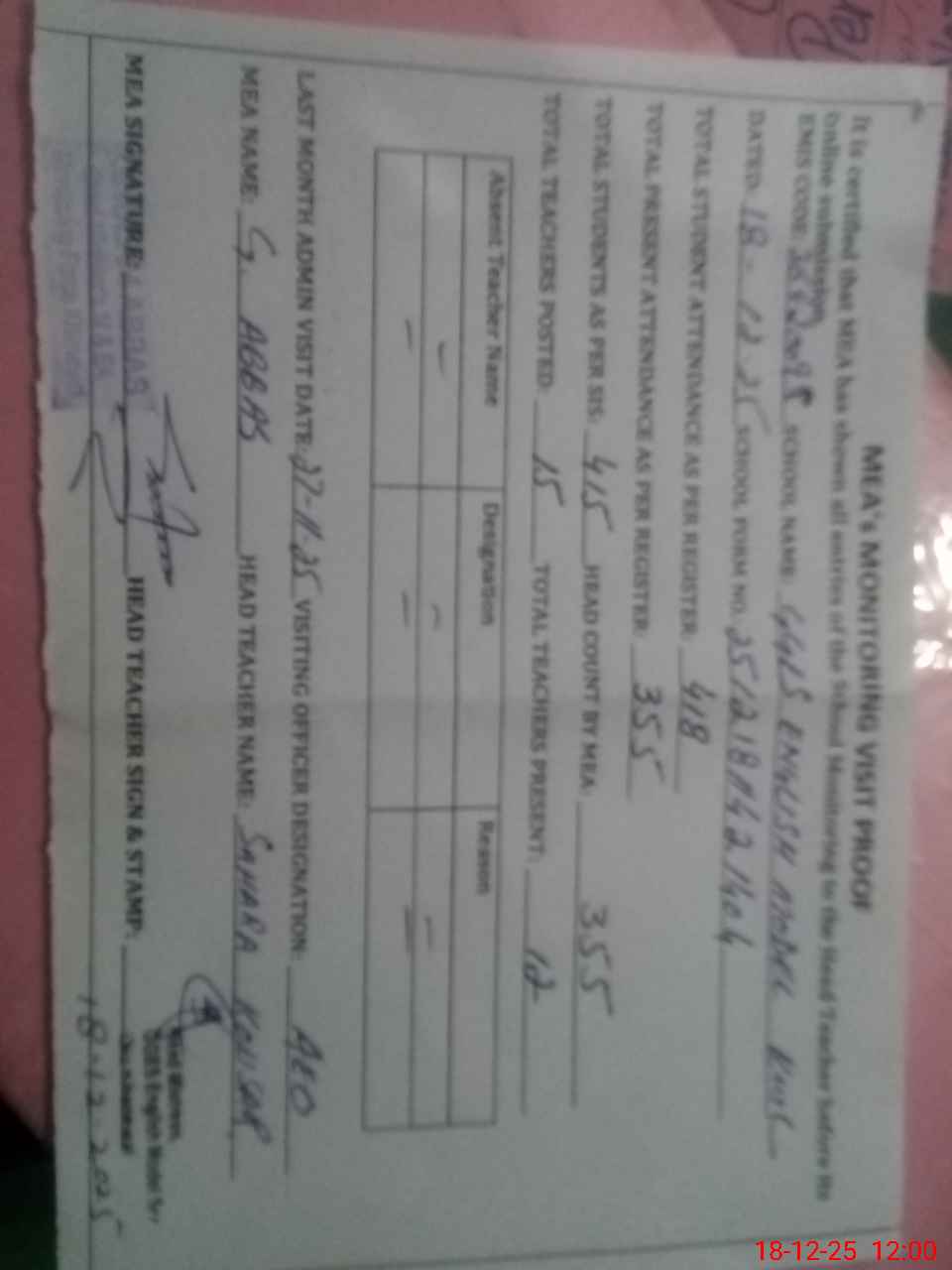 | Attendance Register | Head Teacher | MEA with School | Visit Proof |