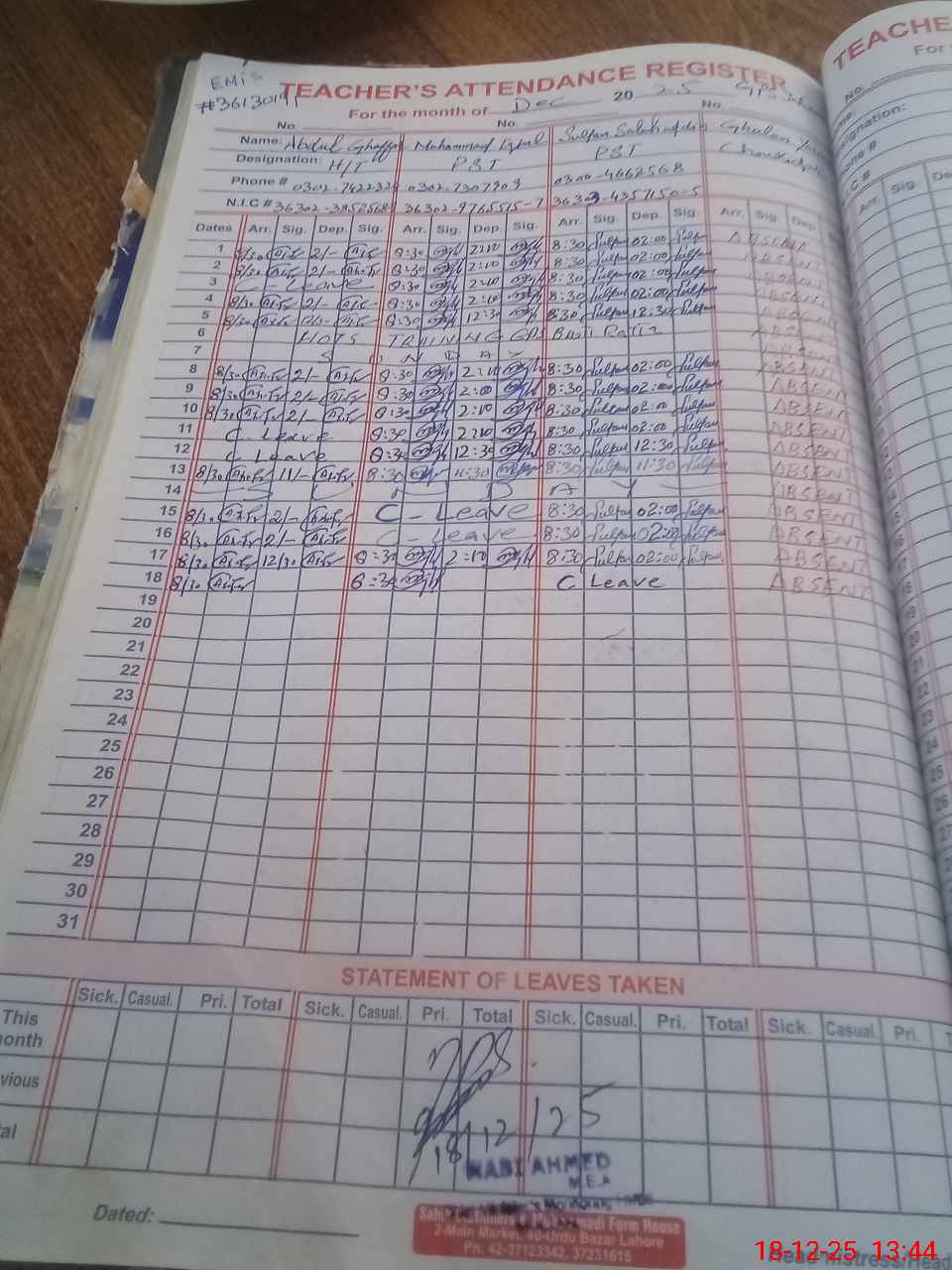 | CNIC | Full Name | Designation | R/C | Absence During Last Calender Month |