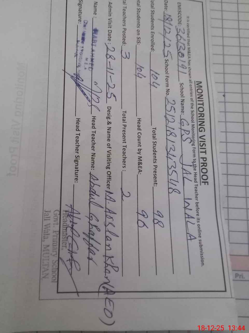| Attendance Register | Head Teacher | MEA with School | Visit Proof |