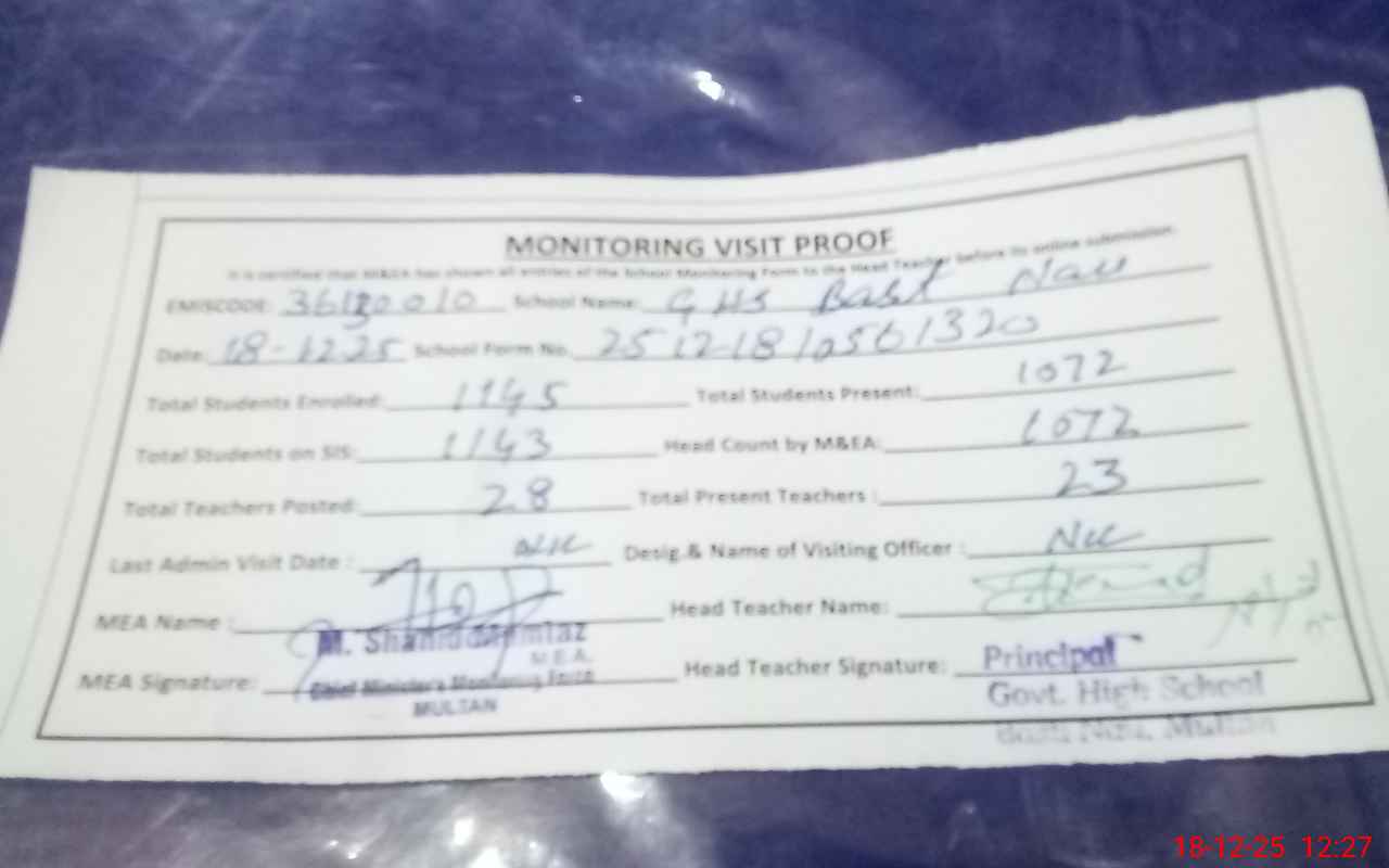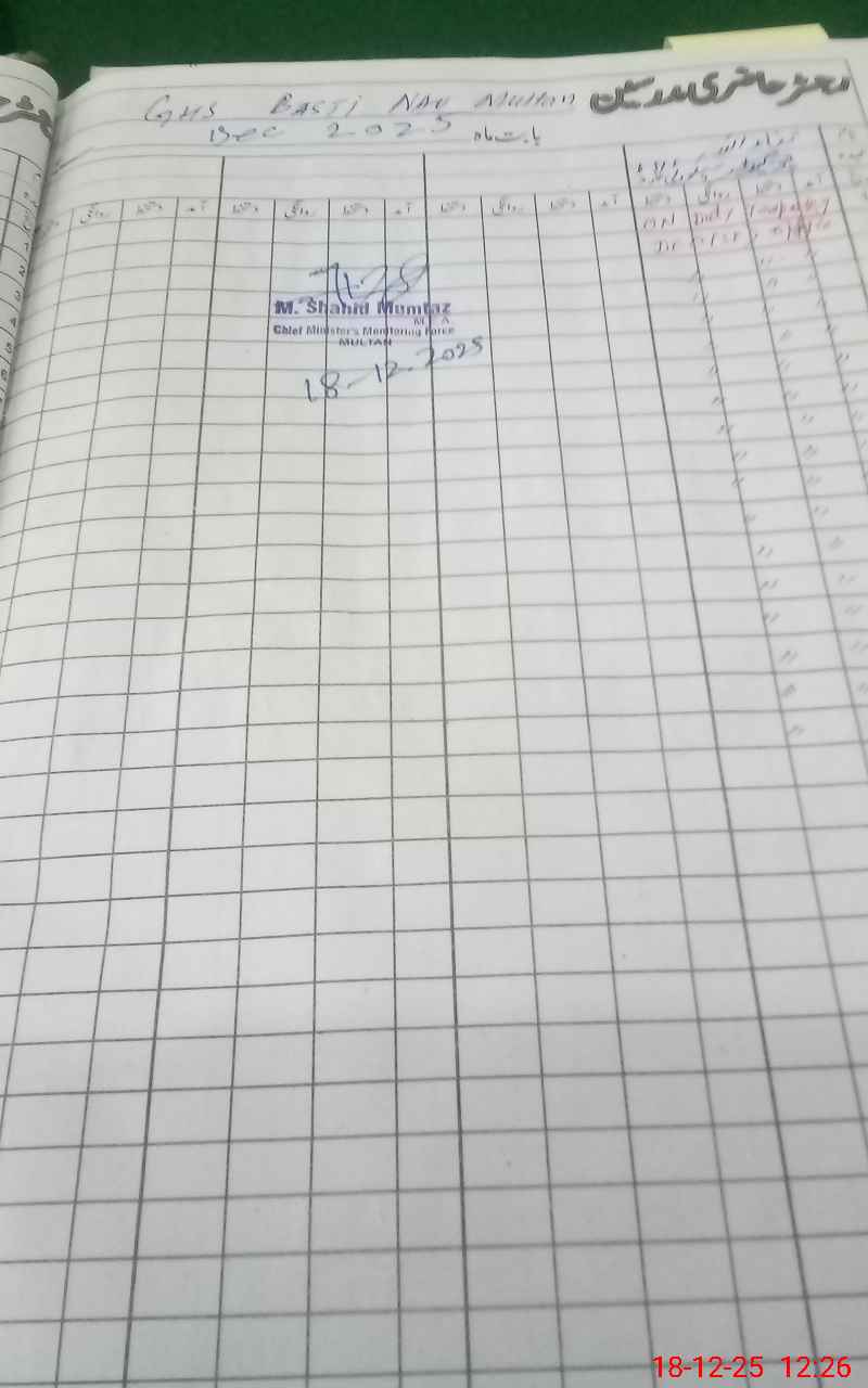 | EMIS Code: 36130010 | Name of School: GHS BASTI NAU MULTAN | |||
