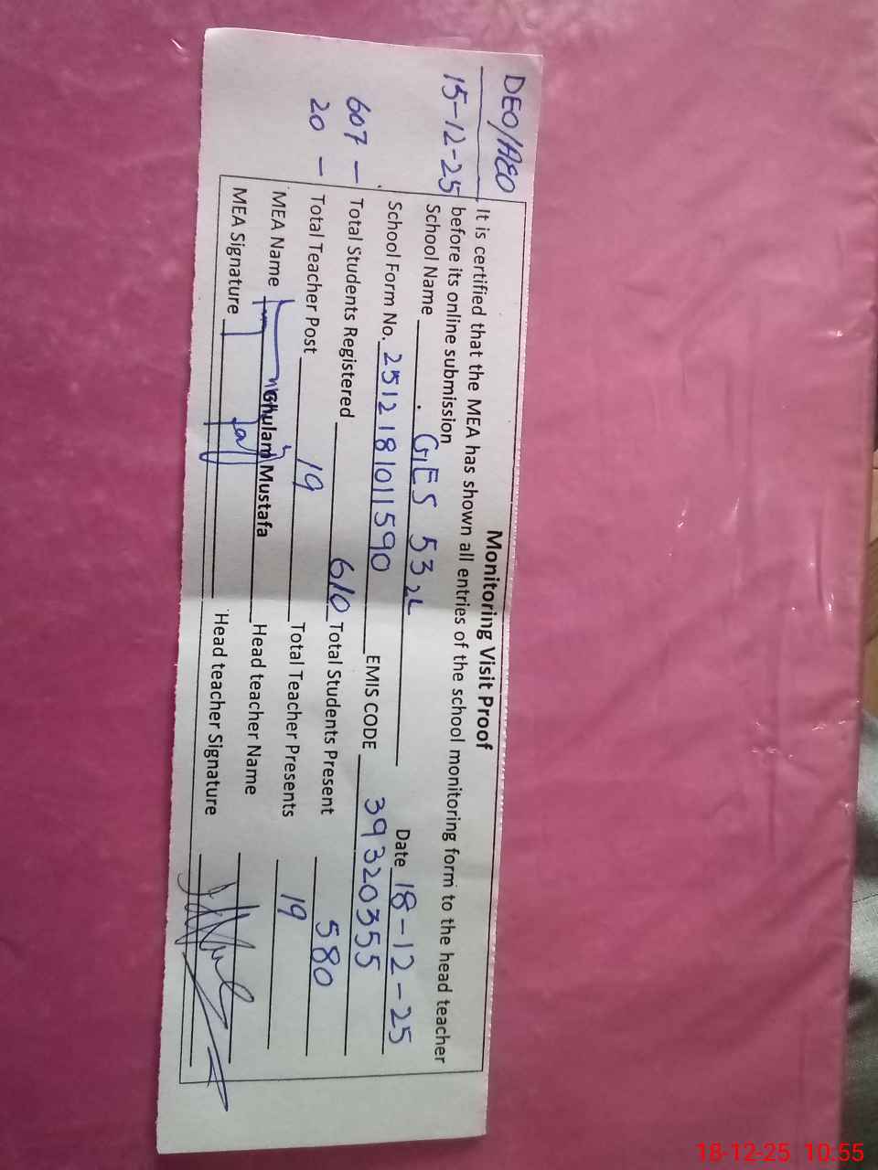 | Remarks (Use Separate Page if Required): DEO visited on 06.12.25 and also visited with AEO on 15.12.25 . 05 toilets are under construction Only 01 toilet of teaching staff is in use, remaining all 09 toilets are locked due to non-operational of sewerage system. Boundary wall of playground assessed partially . | |||||