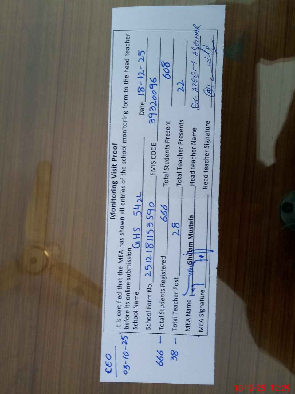 | Certified that this School was Inspected by the Undersigned MEA/DMO Today and the Information Stated Above is as Per Record. | |||||