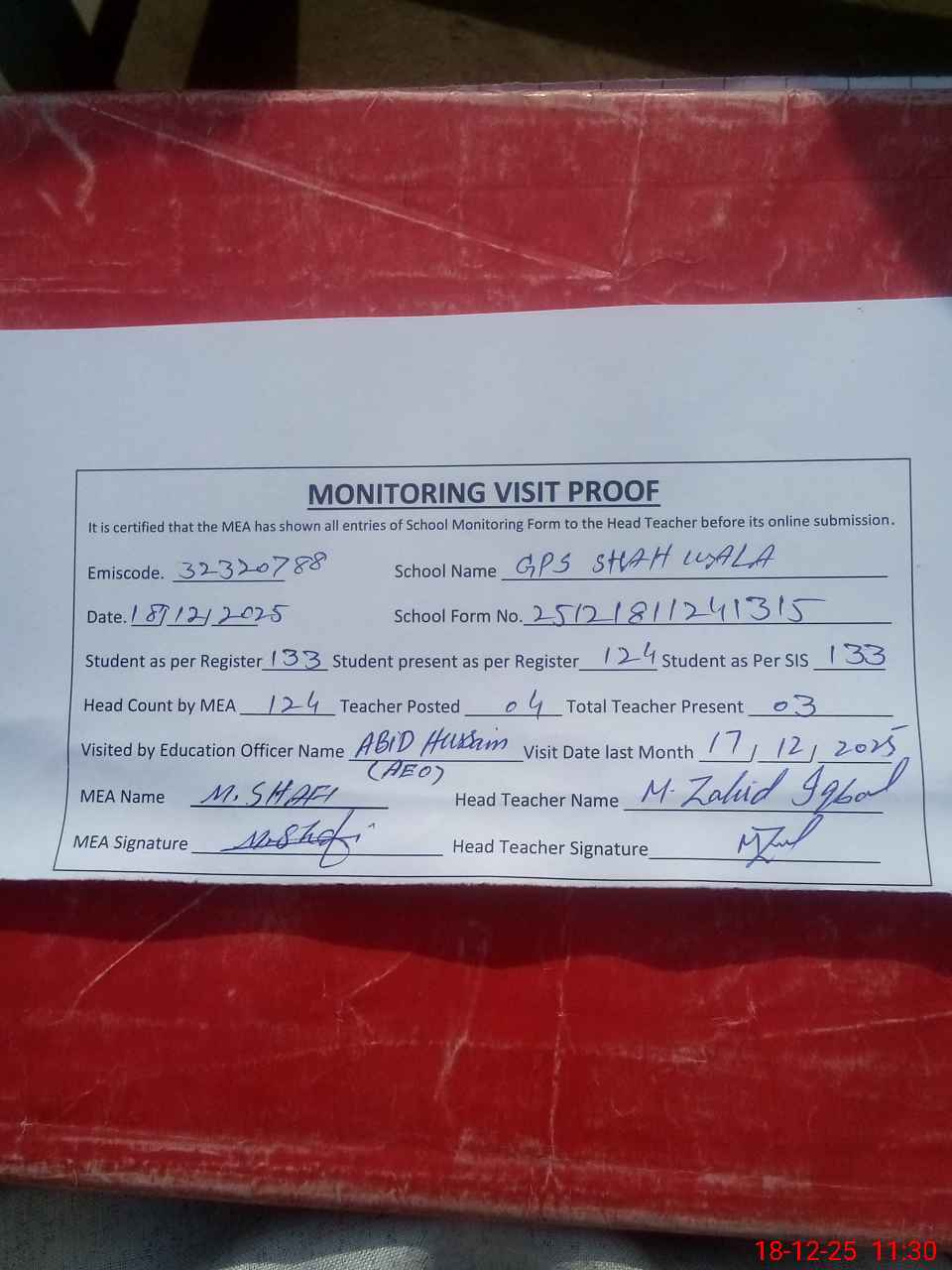 | EMIS Code: 32320788 | Name of School: GPS SHAH WALA | |||
