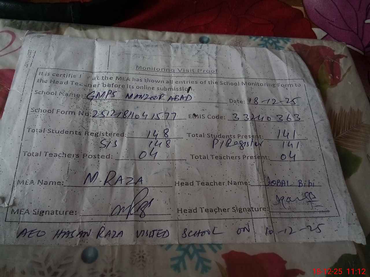 | Attendance Register | Head Teacher | MEA with School | Visit Proof |