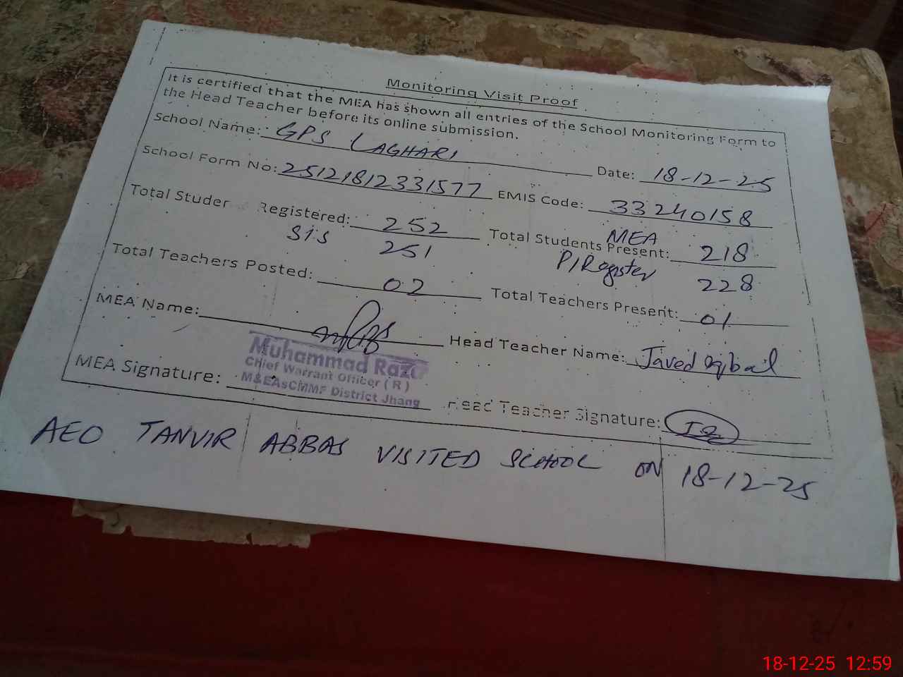| Certified that this School was Inspected by the Undersigned MEA/DMO Today and the Information Stated Above is as Per Record. | |||||
